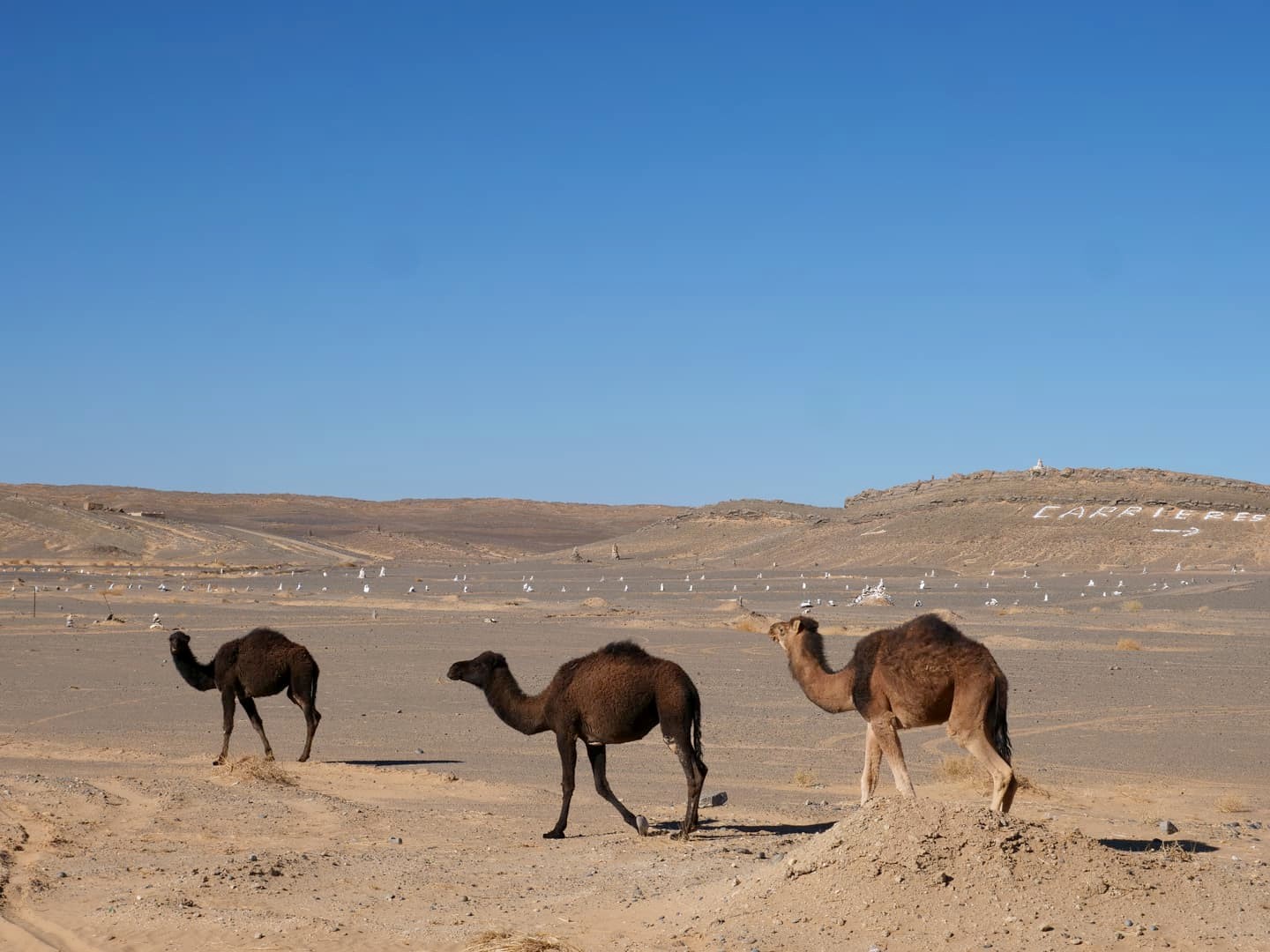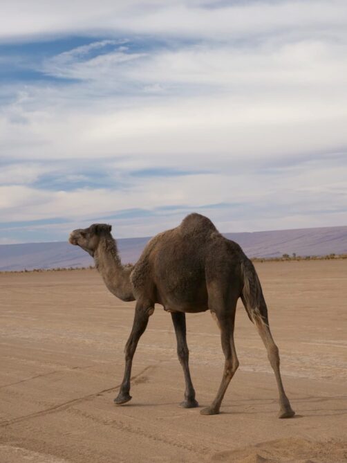 Ensuite, c’est parti pour la longue route vers le désert, le long de laquelle nous croisons d’ailleurs nos premiers dromadaires sauvages ! Nous passons notre première nuit dans le Sahara à Merzouga, la zone la plus touristique, où se trouve également les logements et campements les plus « luxueux ».