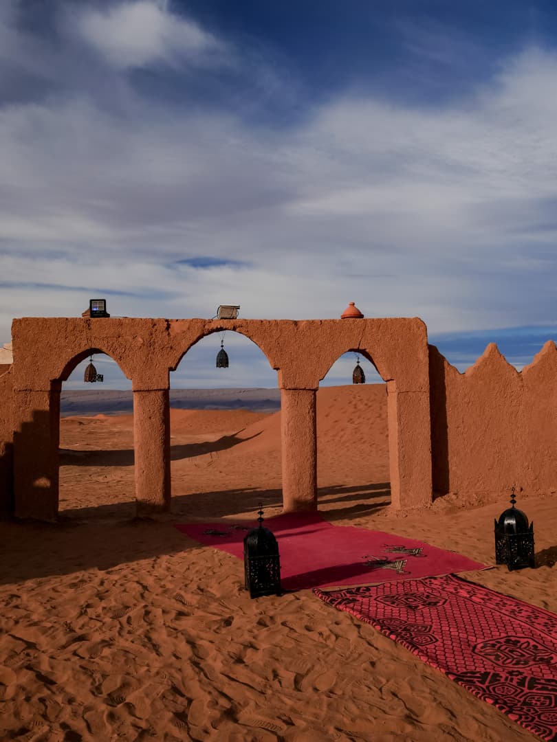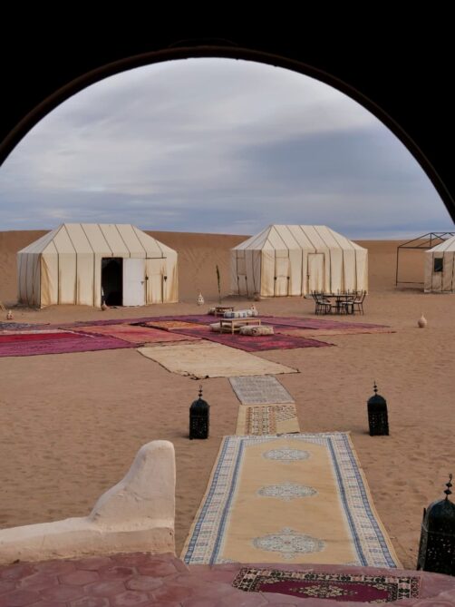 Hébergement : 1 nuit en plein milieu du désert au Bivouac de Nomademoi, l’un des plus éloignés de la route mais aussi l’un des plus proches des plus hautes dunes (c’est aussi pour cela que je l’avais choisi !). L’expérience est bien différente de celle de Merzouga et la nuit assez fraîche en plein janvier, mais l’ambiance familiale du camp, avec feu de camp et musique le soir, était vraiment sympa. Voir plus de photos et les tarifs actuels ici (attention, le transfert en jeep est en supplément).
