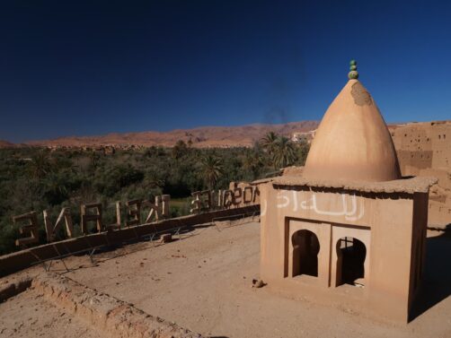 Nous continuons à remonter la Vallée du Drâa en direction de Ouarzazate. En chemin, nous faisons d’abord un arrêt pour visiter la Kasbah des Caids à Tamnougalt (dont la véritable entrée est une fois de plus difficile à trouver : mais l’Auberge Chez Jacob, où nous prenons le thé, nous orientera pour éviter l’arnaque !).