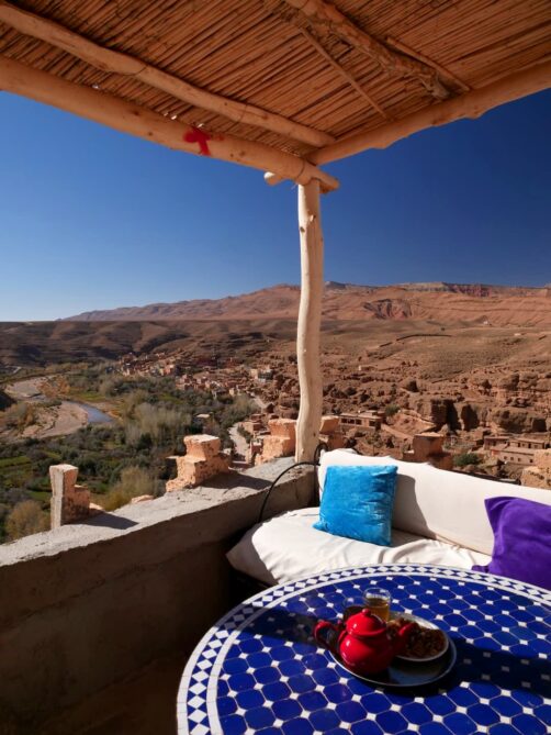 Nous faisons ensuite un détour dans la Vallée des Roses. Je ne m’attendais pas à ce que cette route en cul-de-sac offre des vues aussi splendides ! Si vous avez un jour de plus, cela mérite d’y faire également une étape d’une nuit. L’hébergement avec la plus belle vue est probablement le Dar Timitar, que j’avais repéré et où nous nous sommes donc arrêtés boire un thé. Encore un endroit splendide !