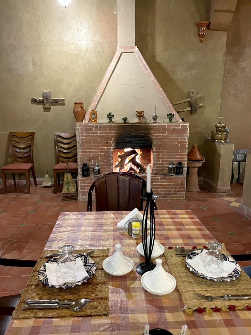 Après le coucher du soleil, nous avons dégusté un excellent repas sur place (celui-ci n’est pas compris dans le prix de la chambre, mais bon marché). On nous avait préparé une jolie table face à un agréable feu de bois, car les nuits sont fraîches en hiver. C’était ultra cosy et nous y avons très bien mangé !
