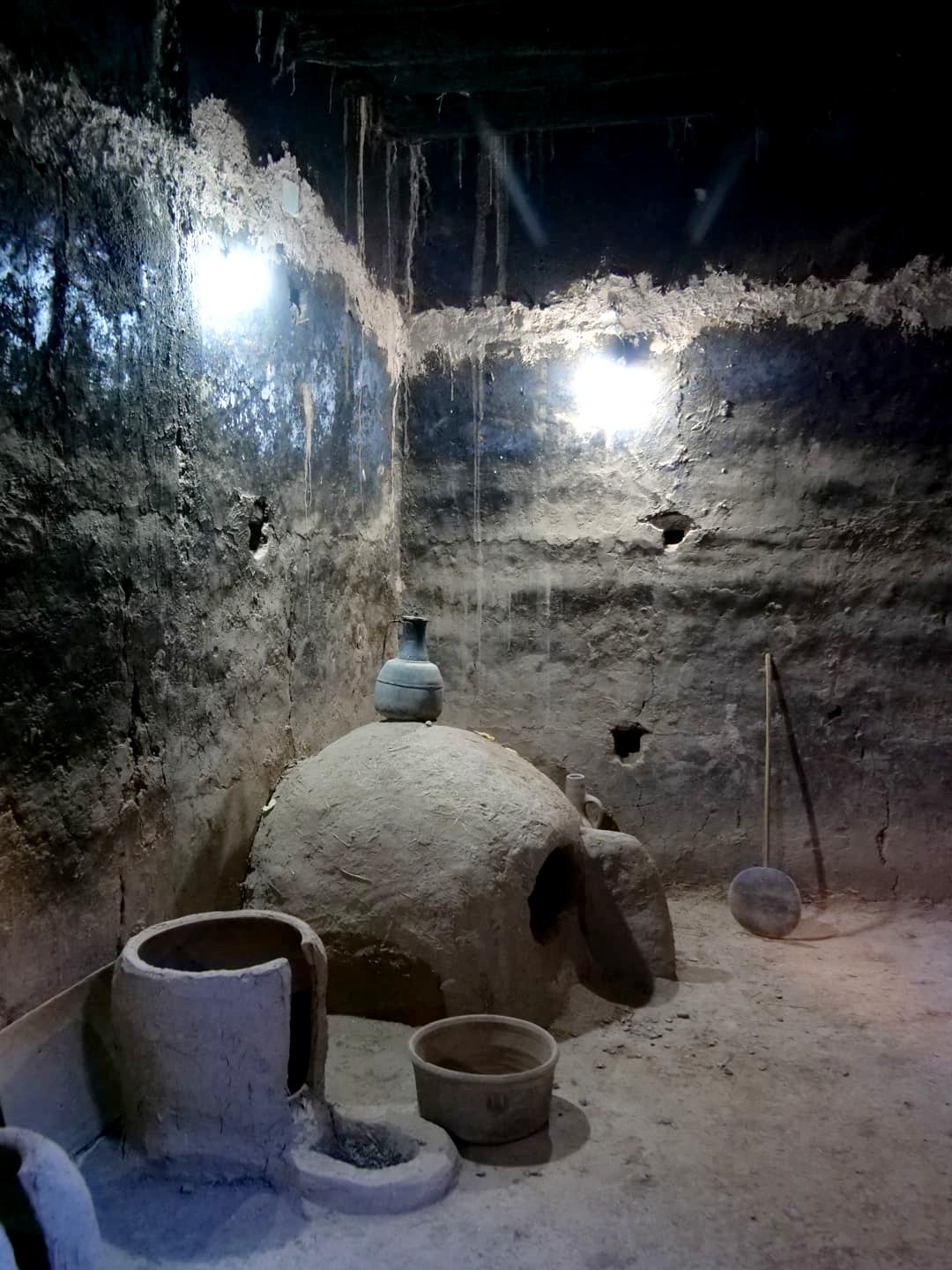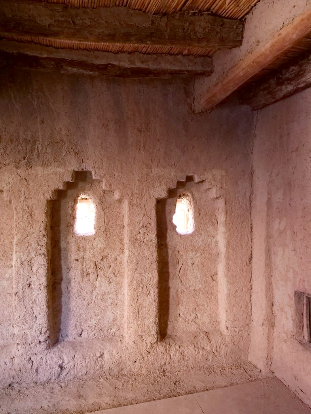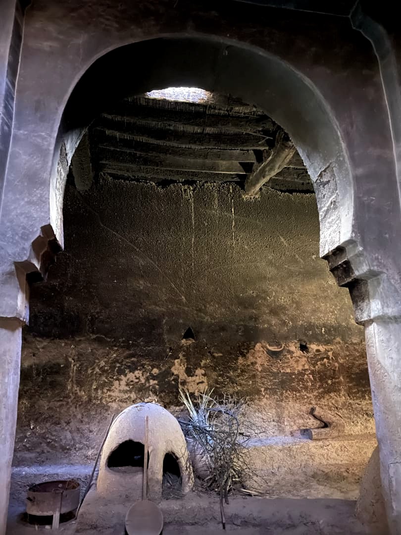 On a commencé par la visite de la partie de gauche, qui est donc la « fausse » kasbah. Ici, vous pourrez découvrir un riad en pisé, avec un petit jardin intérieur, mais il n’y a pas de vues. On peut par contre voir différentes pièces qui témoignent de la vie traditionnelle d’autrefois, notamment les anciennes cuisines (mais on voit aussi tout cela dans l’autre partie).