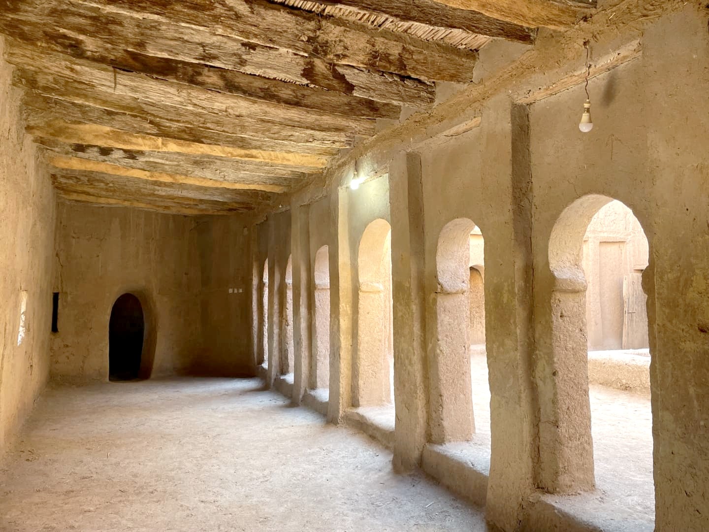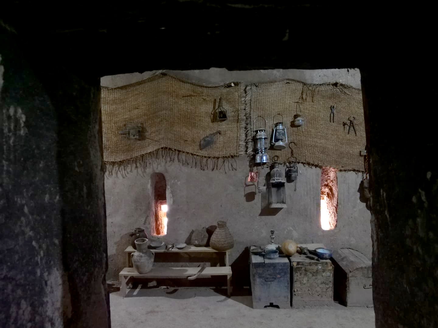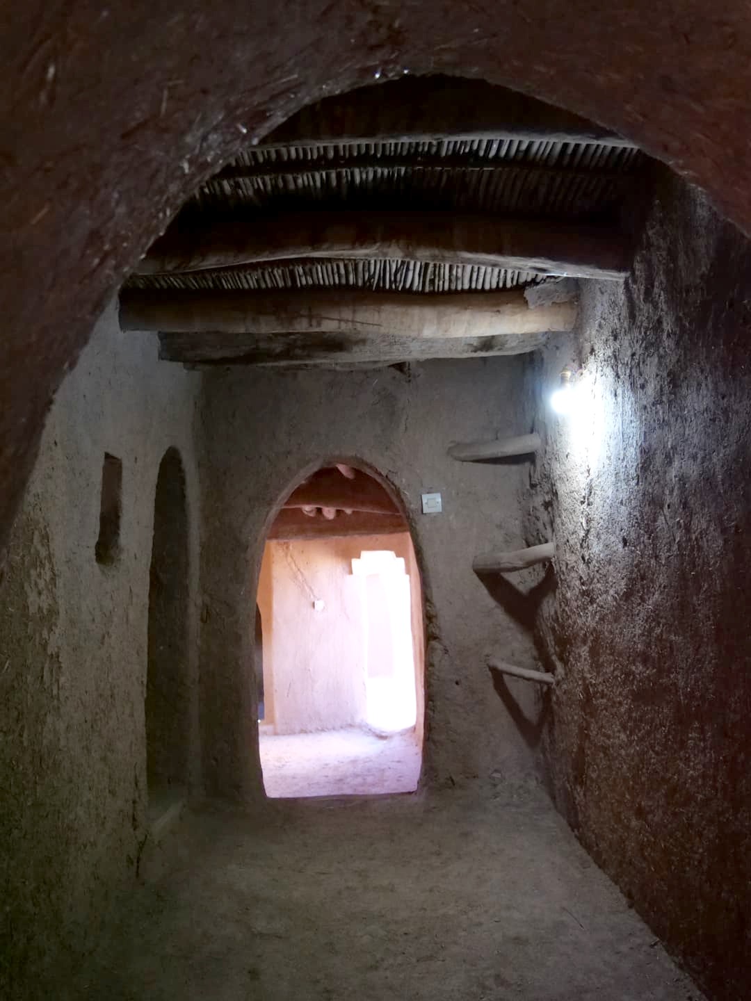 On a commencé par la visite de la partie de gauche, qui est donc la « fausse » kasbah. Ici, vous pourrez découvrir un riad en pisé, avec un petit jardin intérieur, mais il n’y a pas de vues. On peut par contre voir différentes pièces qui témoignent de la vie traditionnelle d’autrefois, notamment les anciennes cuisines (mais on voit aussi tout cela dans l’autre partie).