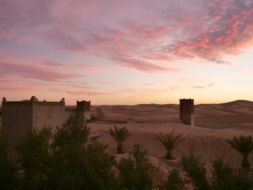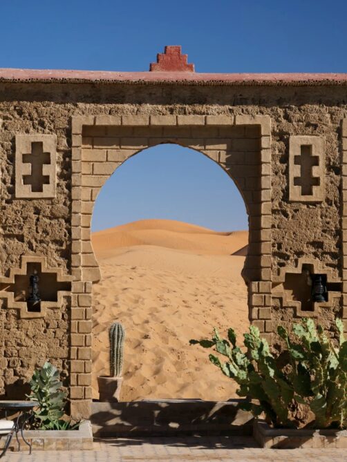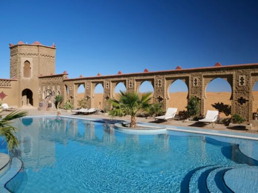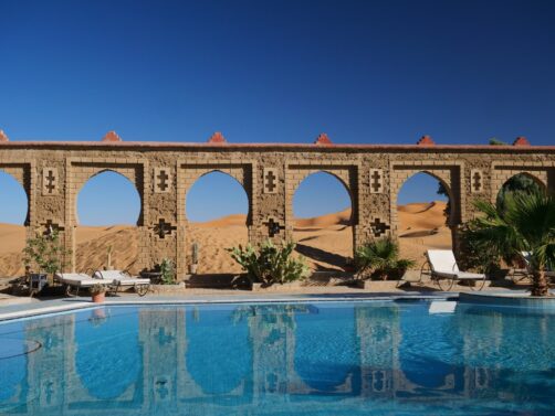 Située aux portes de l’Erg Chebbi, Merzouga est l’une des plus belles zones du désert du Sahara au Maroc, mais aussi l’une des plus touristiques. Ses très photogéniques dunes de sable sont parsemées d’une multitude de camps, plus ou moins confortables, qui permettent de vivre une expérience plus ou moins authentiques dans le désert. Mais comme nous avions décidé de garder cette expérience de campement dans le désert pour une autre partie du désert beaucoup moins fréquentée, l’Erg Chigaga (qui fut l’étape suivante de notre roadtrip dans le sud marocain), nous avons décidé de profiter d’une des autres particularités de Merzouga, qui la distingue de toutes les autres zones accessibles du Sahara : ses hébergements luxueux au bord des dunes. On croirait presque à un mirage ! Dans cet article, vous découvrirez pourquoi ce fut l’une des étapes les plus mémorables de notre voyage…