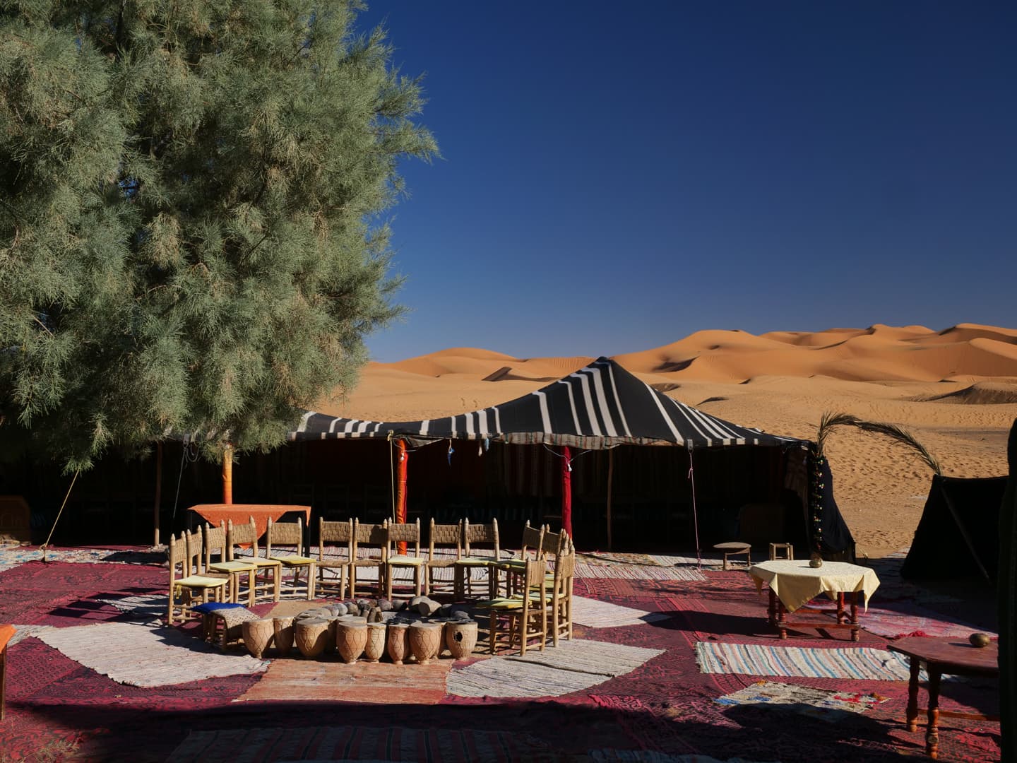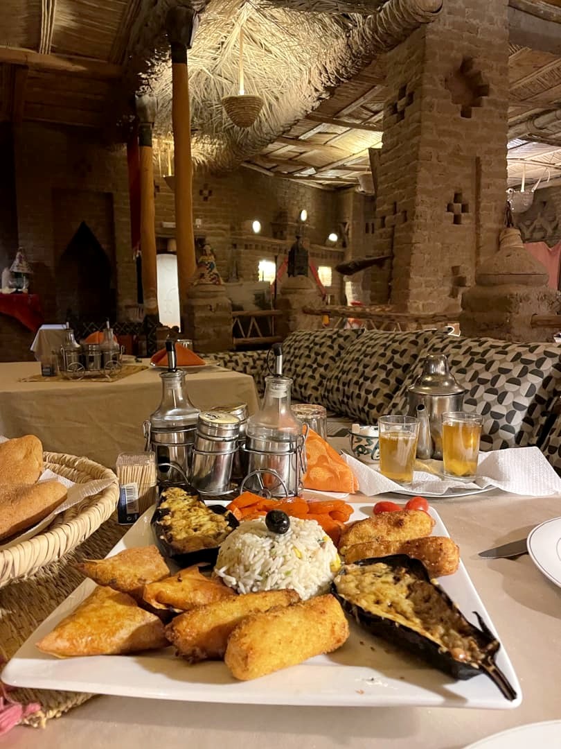 Après cette splendide balade, un bon repas nous attendait au Café du Sud. Le soir, l’hôtel installe également un petit camp aux pieds des dunes, où l’on peut écouter de la musique berbère. Parfait pour avoir quand même une petite expérience de camp, mais avec tout le confort possible !