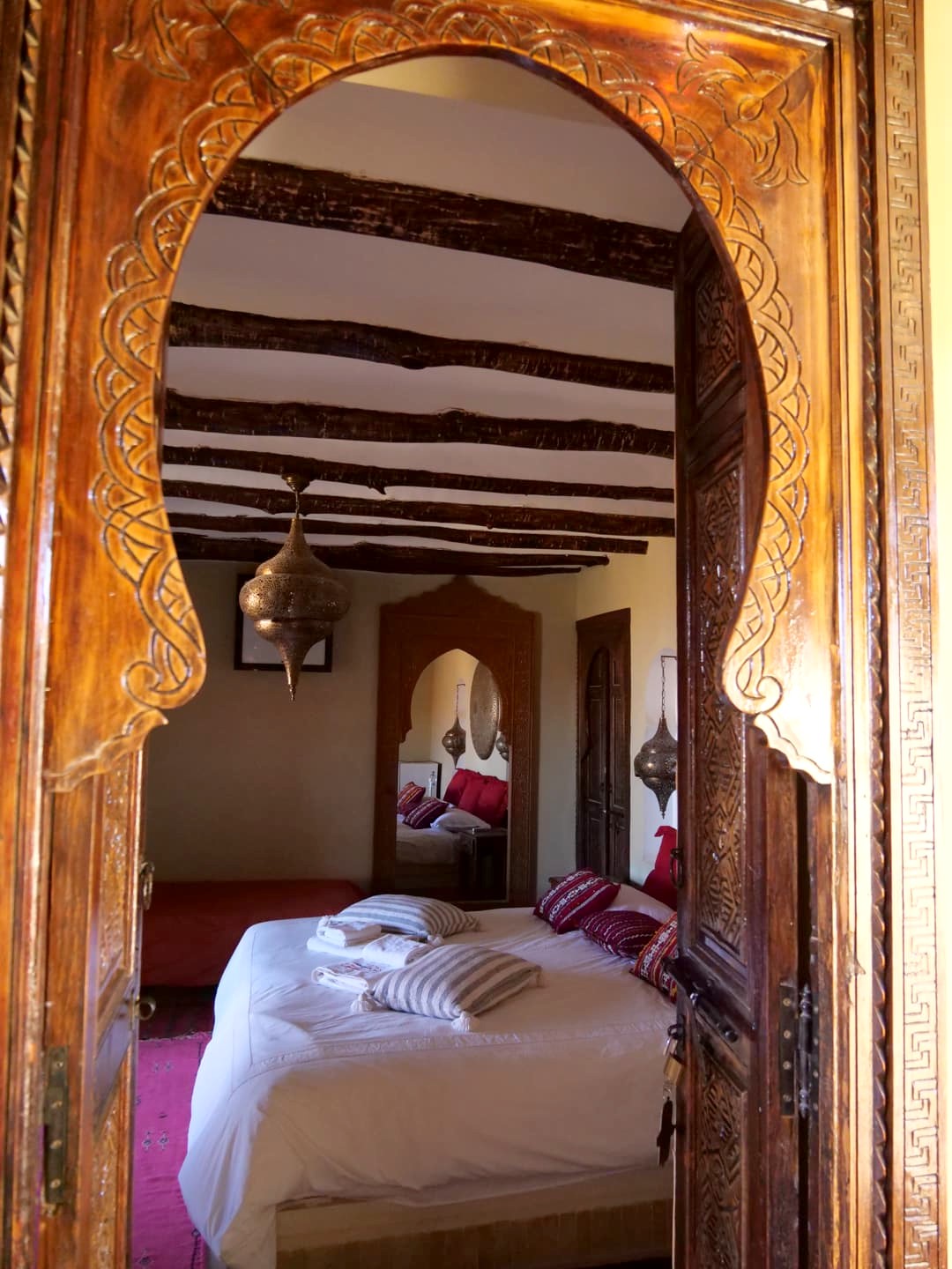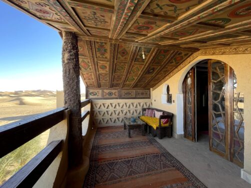 Les quelques chambres du Riad Café du Sud se trouvent dans ce bâtiment secondaire, situé à quelques mètres du bâtiment principal (et de la piscine). Elles sont très romantiques, en mode 1001 nuits, et puis surtout, elles ont une vue à couper le souffle sur le désert ! La chambre dans laquelle nous avons séjourné, au premier étage, possédait un grand balcon avec vue sur le désert. Il n’y a pas de mot pour décrire la beauté de cet endroit, vraiment. En plus, comme le bâtiment est un peu en retrait, c’est vraiment très calme. Et je peux vous dire que nous étions bien contents de dormir bien au chaud ce soir-là vu les températures nocturnes !