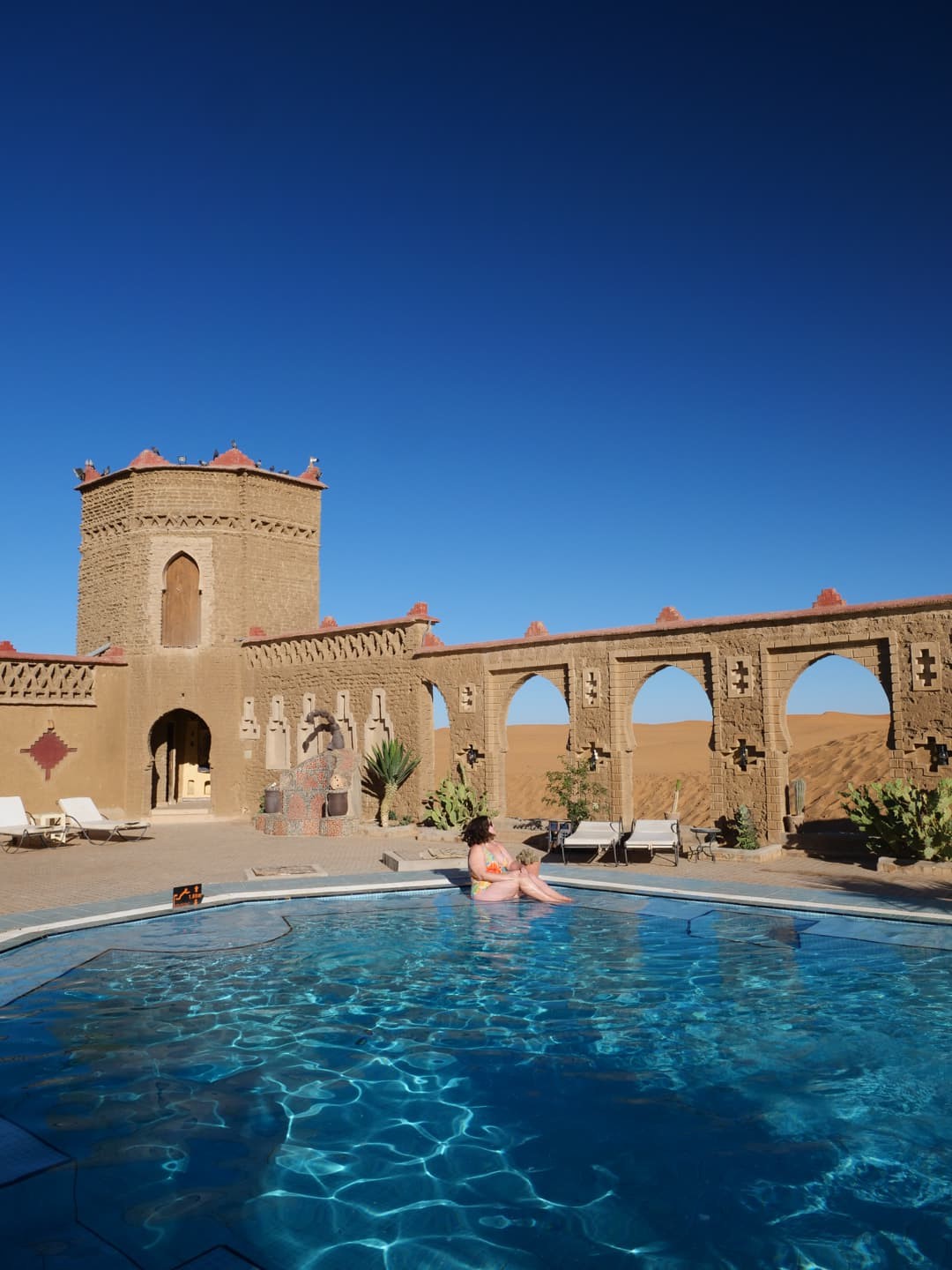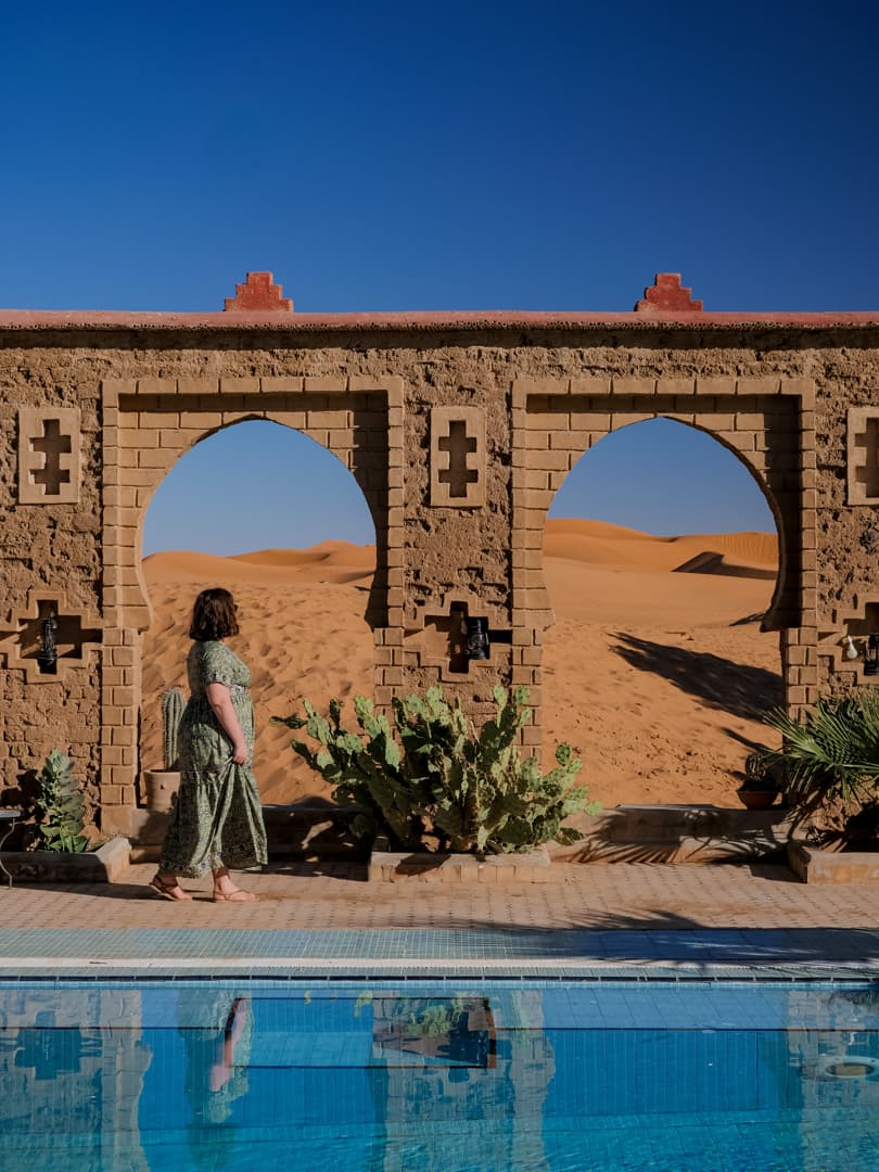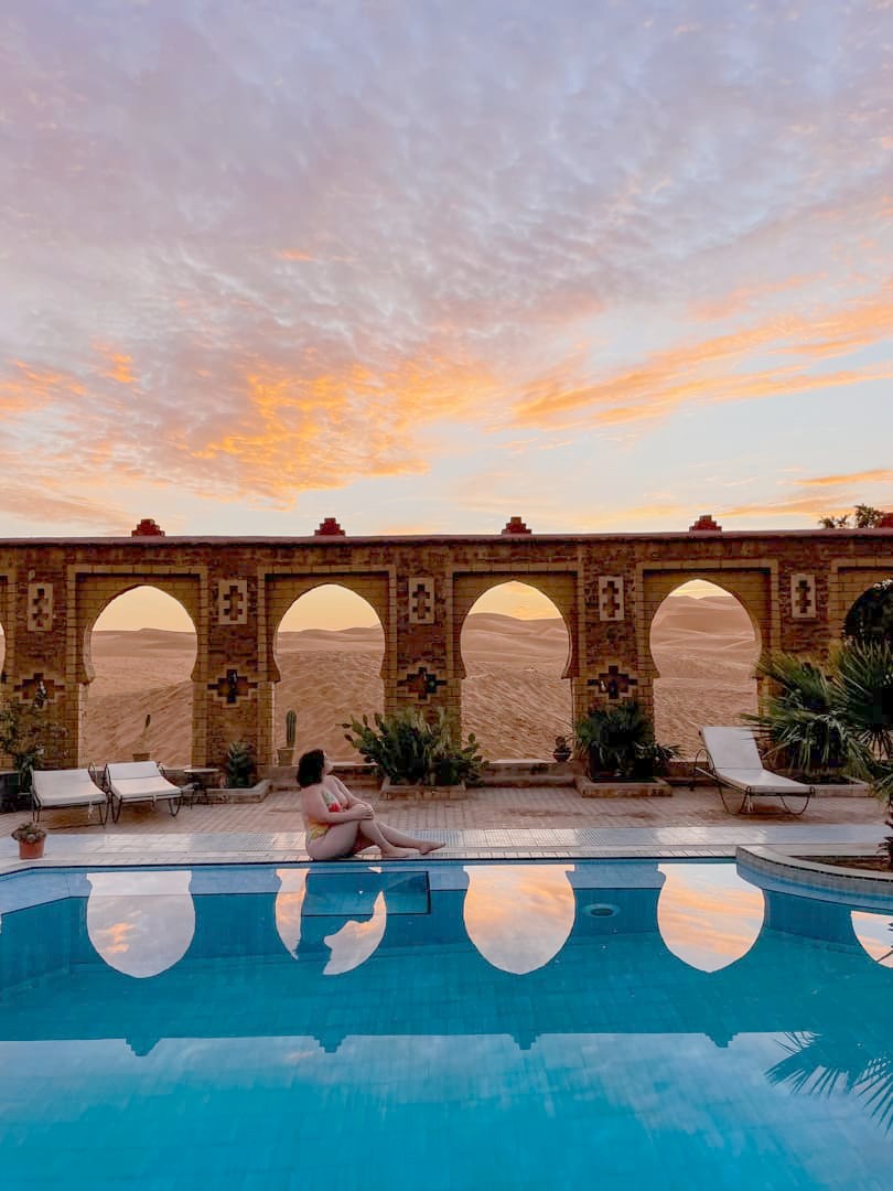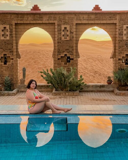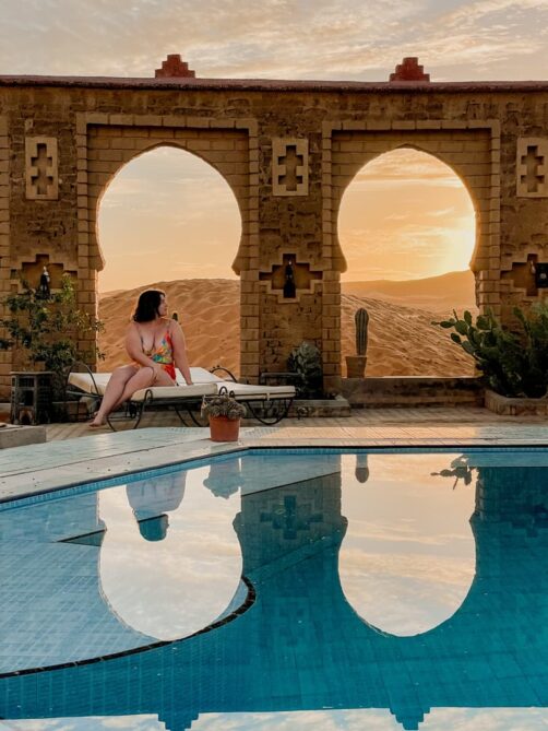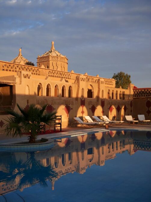 Je tiens également à vous noter deux autres endroits que j’avais repérés et qui ont l’air tout aussi incroyables (mais il fallait bien faire un choix) : le Dar Morocco (une adresse très récente, avec également une belle piscine) et l’Hotel Kanz Erremal (en général un peu moins cher). Depuis mon voyage, un nouvel hôtel à la déco très tendance a également ouvert : le Sahara Pearl Hotel (et je crois que leur piscine peut être en compétition avec celle du Café du Sud !).