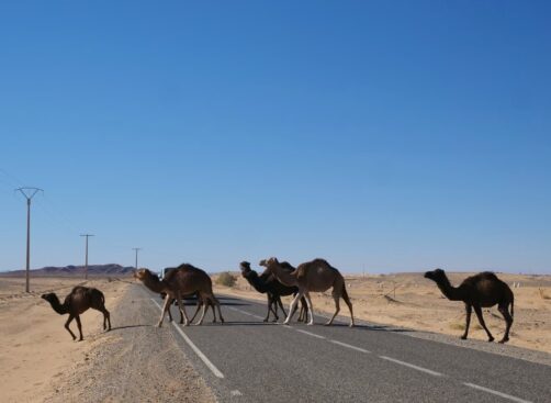 Depuis notre étape précédente, la palmeraie de Tinghir, il nous a fallu environ trois heures de route pour rejoindre Merzouga. La route est très facile et en bon état et vous trouverez régulièrement des stations d’essence. Au fur et à mesure, le paysage se fait de plus en plus désertique, évidemment. Sur la fin, nous avons croisé plusieurs dromadaires le long de la route. Il faut d’ailleurs faire attention, car ils peuvent causer quelques « bouchons » en traversant en groupe !