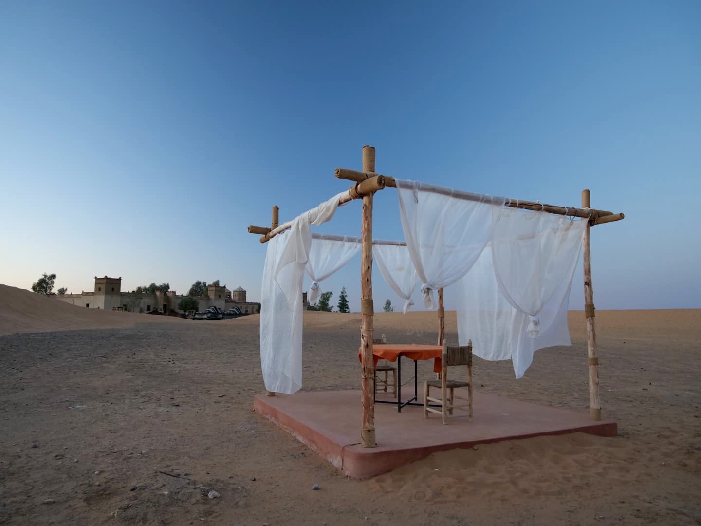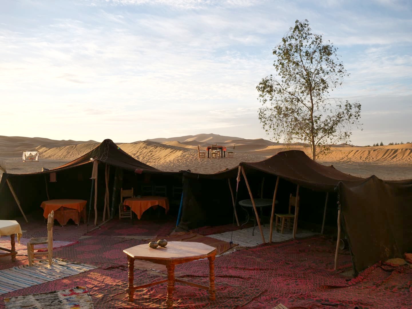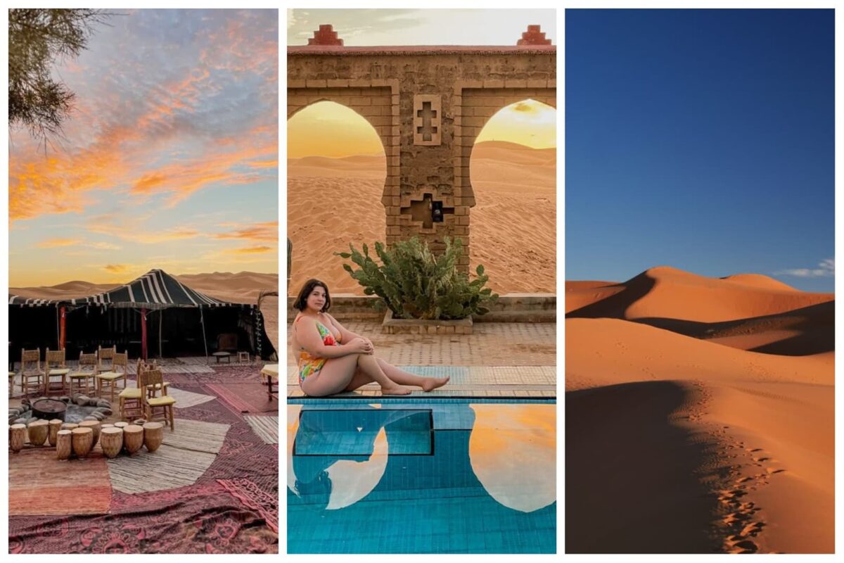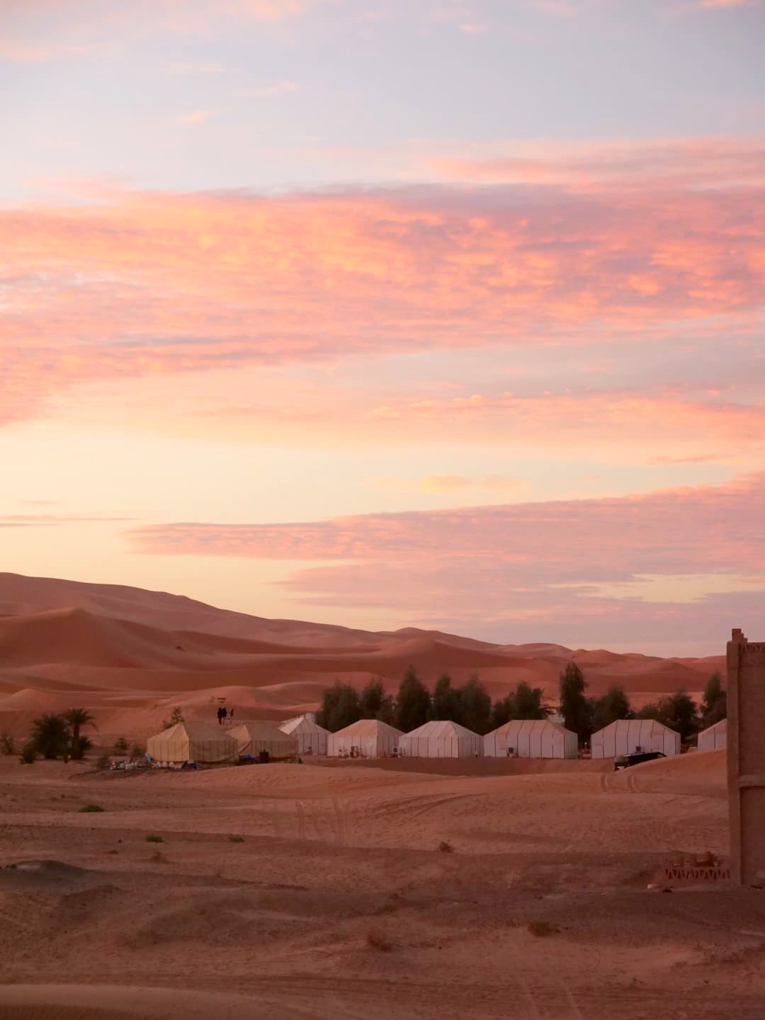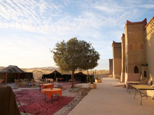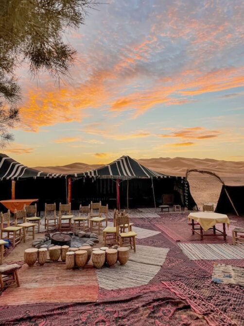 Voici les deux options que j’avais retenues au niveau des campements dans le désert : le Sahara Majestic Luxury Camp (un de ceux qui avaient l’air le plus confortable, avec même une petite piscine !), et le Orient Desert Camp Merzouga (pour sa petite taille et sa décoration). Ces deux camps ont la demi-pension comprise de base : attention aux camps qui ne proposent pas de formule comprenant le repas du soir car ça peut vite faire monter le tarif également (évidemment, dans le désert, pas d’autres options si vous voulez manger !).