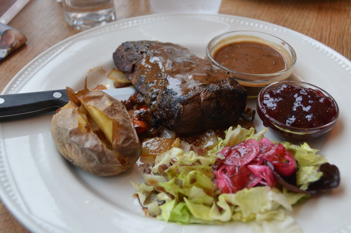 Comme nous sommes dans la région des baleines, et pour ne pas mourir idiote, je décide après un long pourparler avec moi-même de goûter un steak de baleine. C’est quelque chose que je ne mangerais certainement jamais dans un autre pays, mais l’Islande est le seul pays au monde (à ma connaissance) à avoir une chasse à la baleine raisonnée, je ne me sens donc pas (trop) coupable de vouloir tenter cette expérience.