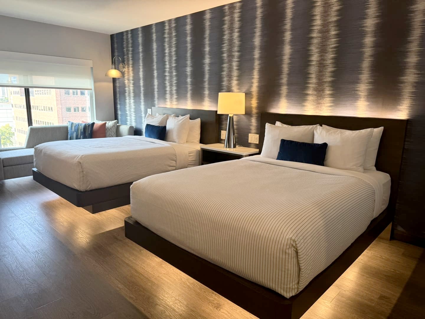 Nous avons séjourné deux nuits au Cambria Hotel Detroit Downtown, un boutique-hôtel ouvert en 2023, installé dans un splendide bâtiment Art Déco rénové avec goût. Notre chambre avec deux grands lits doubles, qui sentait encore le neuf, était très confortable et bien au calme. Les petits plus de cet hôtel, ce sont également son rooftop bar, et pour une activité originale son simulateur de golf au sous-sol !
