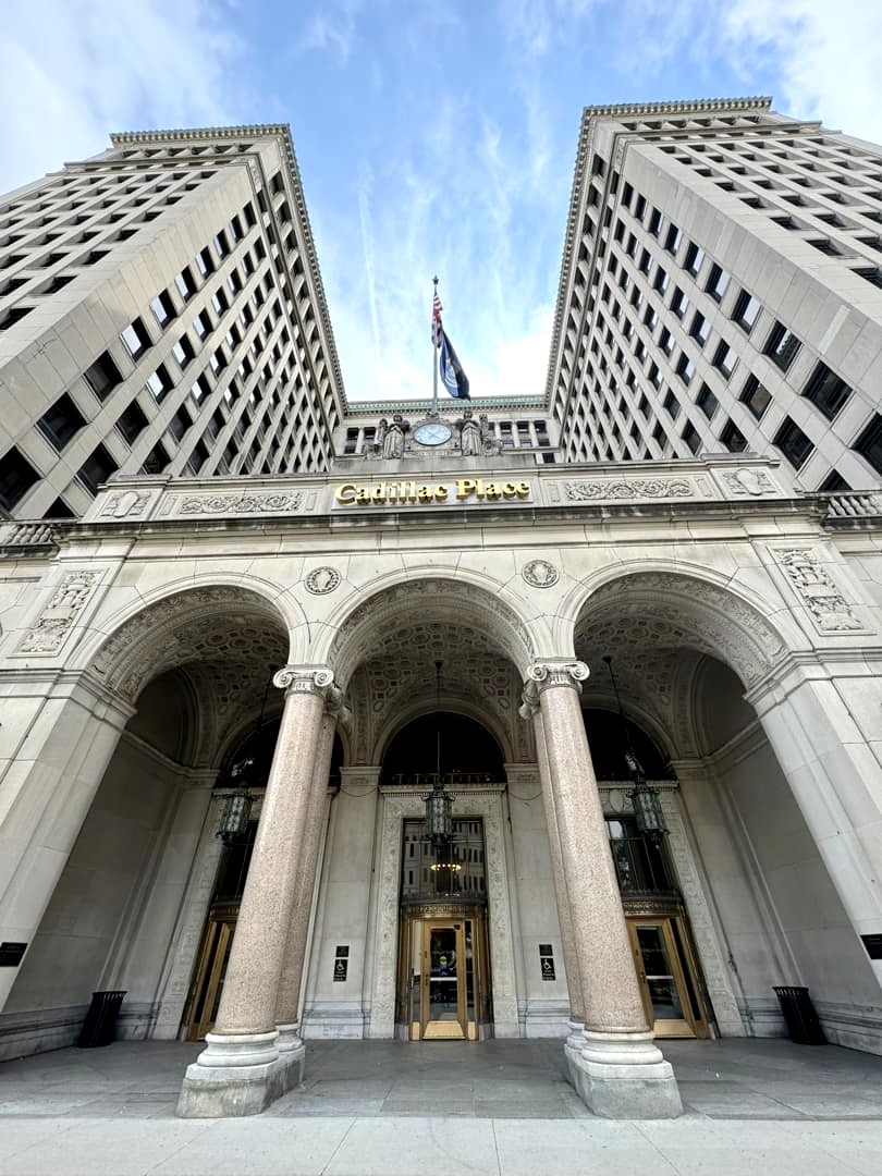 Et tant que vous y êtes, faites aussi un petit arrêt juste en face au Cadillac Place, autre célèbre bâtiment historique de Detroit.
