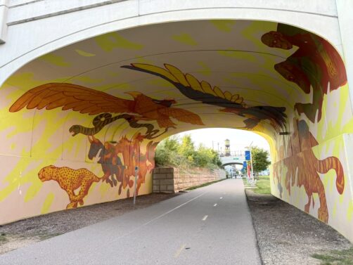 Mais même si, comme nous, vous n’y êtes pas un jour de marché, Eastern Market vaut également la visite pour découvrir ses très nombreuses oeuvres de street art ! Suivez les fresques murales pour rejoindre la Dequindre Cut, une ancienne ligne de chemin de fer transformée en un très agréable sentier urbain entouré d’encore plus de street art. En suivant celle-ci depuis Eastern Market, vous rejoindrez l’une des plus belles parties du Riverwalk…