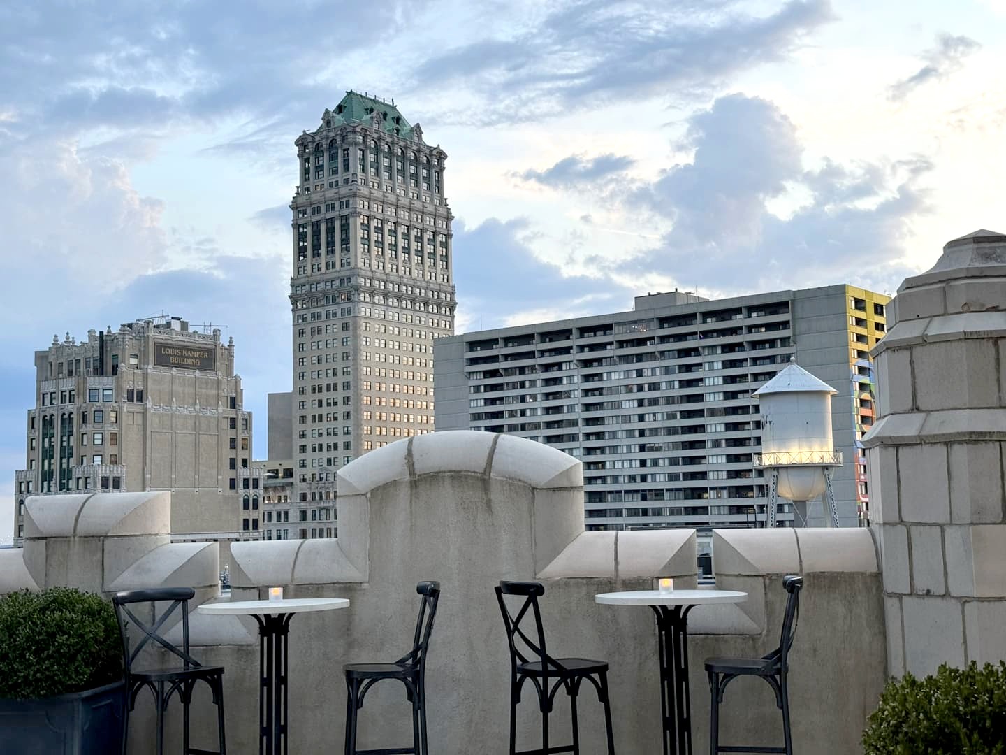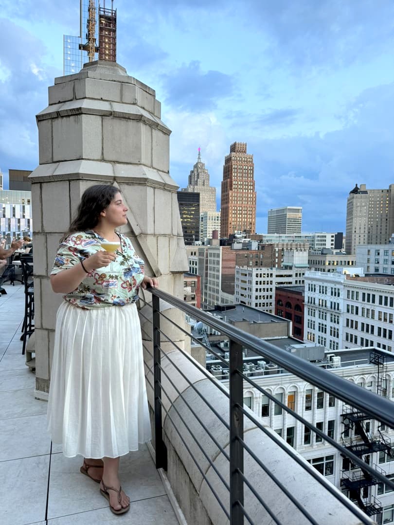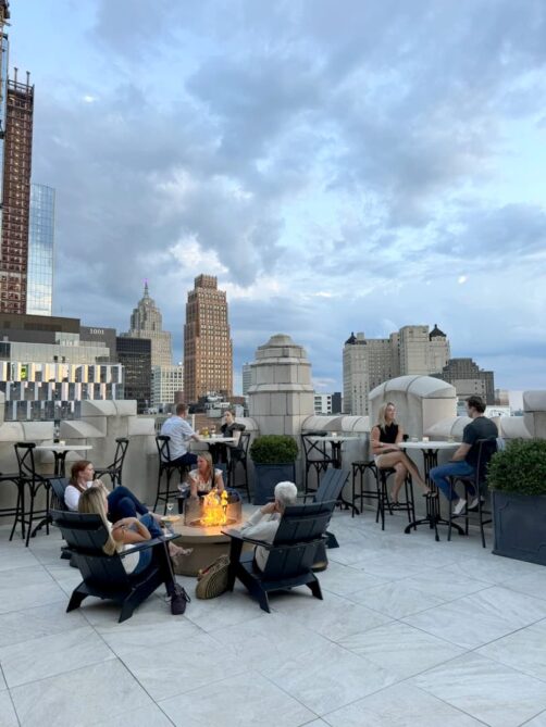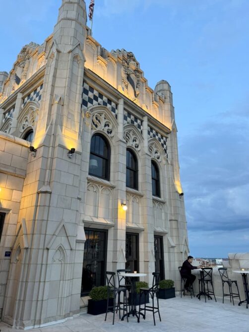 Le rooftop bar que j’ai préféré à Detroit, c’est The Monarch Club ! Celui-ci se trouve au sommet d’un autre gratte-ciel historique de Détroit, le Metropolitan Building, très photogénique avec ses airs de châteaux (il abrite aussi un hôtel, le Element Detroit). C’est l’endroit parfait pour profiter du coucher du soleil : même si le service peut mieux faire, les cocktails sont sympas (comptez 18-20$ hors taxes et tips) et le cadre est vraiment splendide.