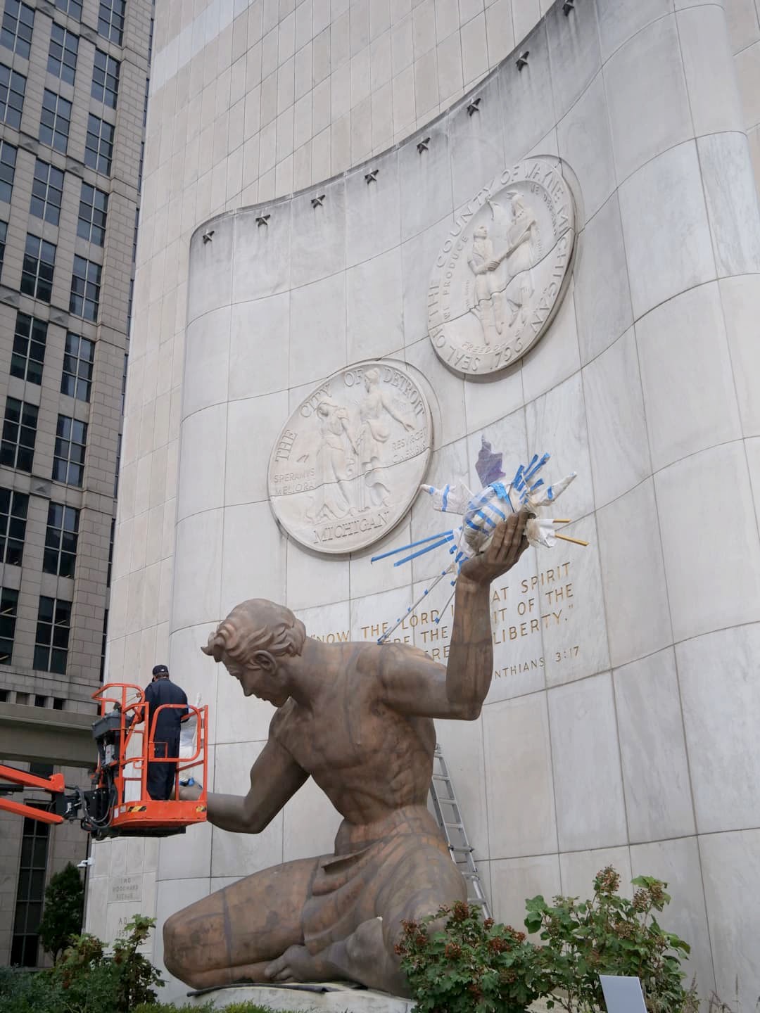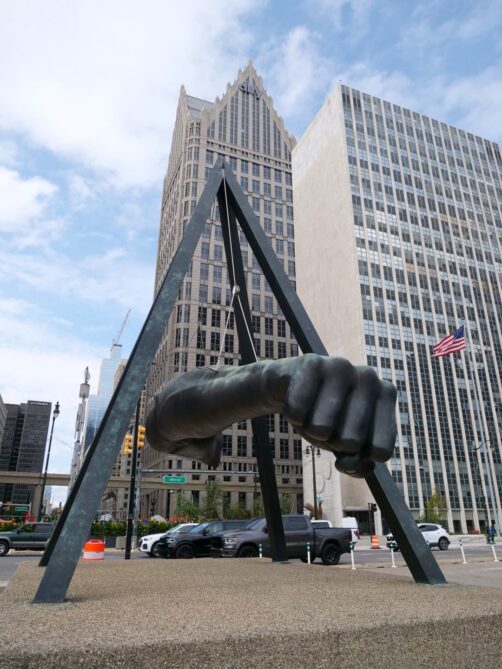 En prenant la direction du RiverWalk et de la Hart Plaza, passez également par la statue Spirit of Detroit, un des symboles de Détroit (elle était en rénovation lors de notre visite) et par la Joe Louis Fist Statue, dédiée à un célèbre boxeur originaire de Détroit.