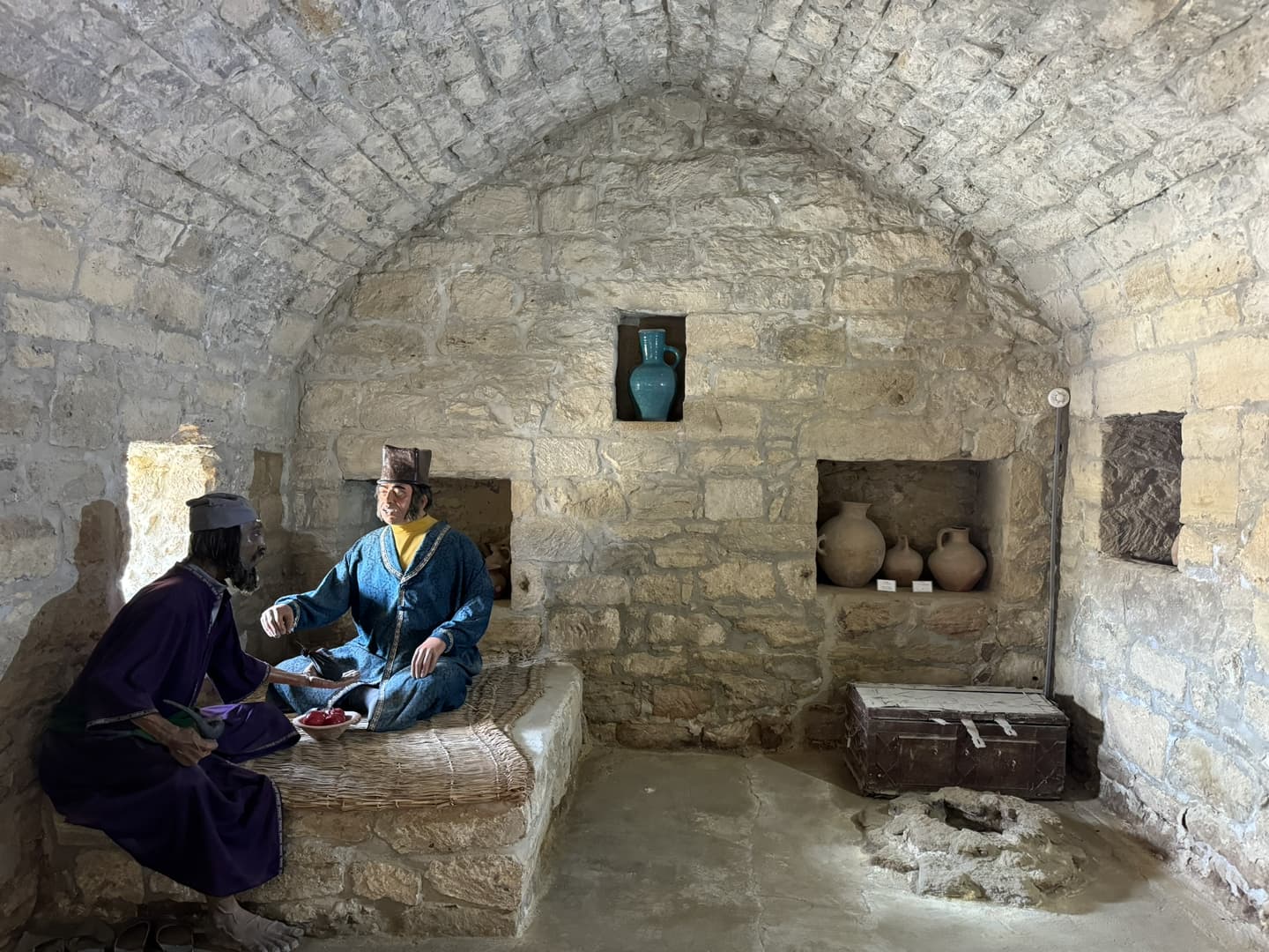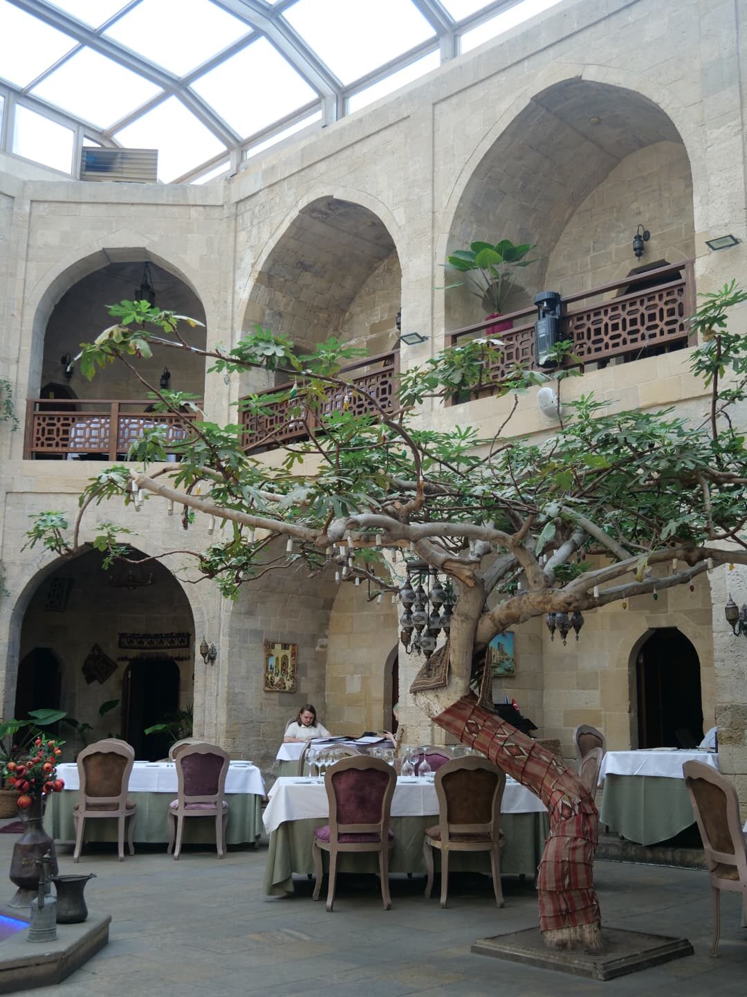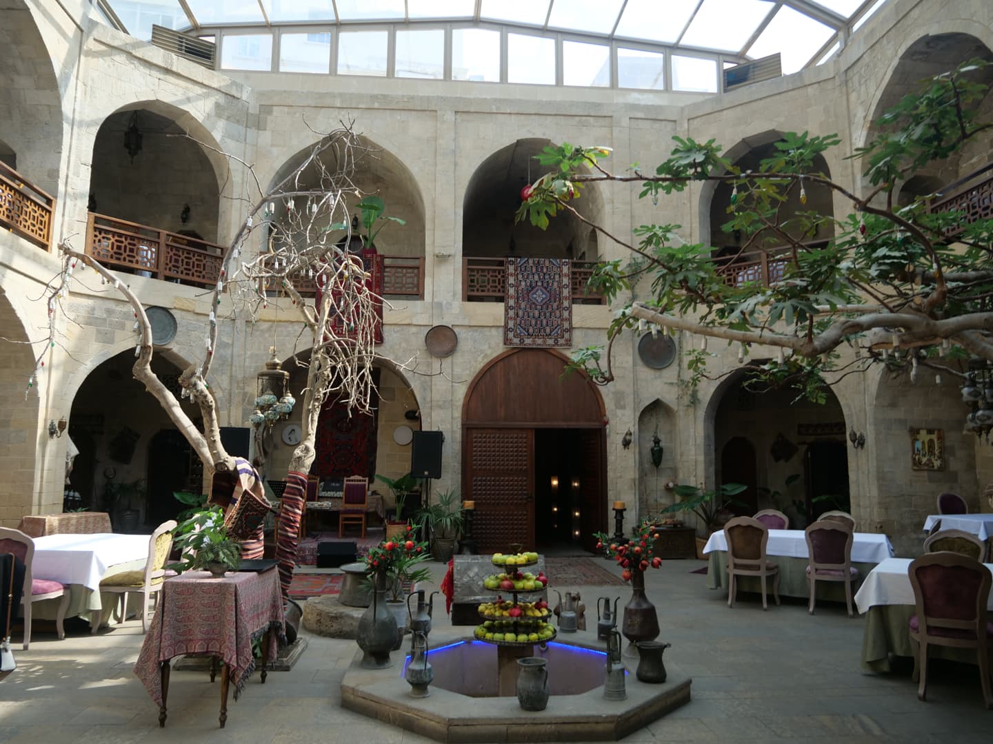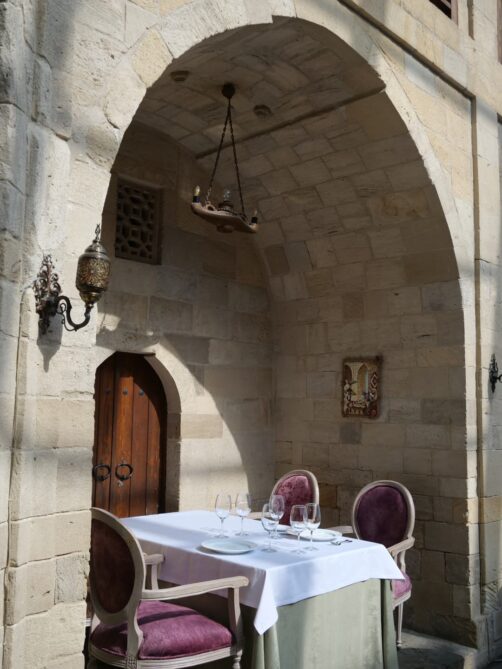 A Baku, quelques caravansérails de la Route de la Soie ayant survécu jusqu’à nos jours sont devenus des restaurants. Et notre expérience au Mugam Klub fut l’un des meilleurs repas de ce voyage. On déguste dans ce cadre unique une large gamme de spécialités du pays, notamment de très bons qutab fourrés, et de très copieux plateaux de kebabs (mention spéciale pour celui à la viande d’agneau hachée fourré aux cerises : un régal).