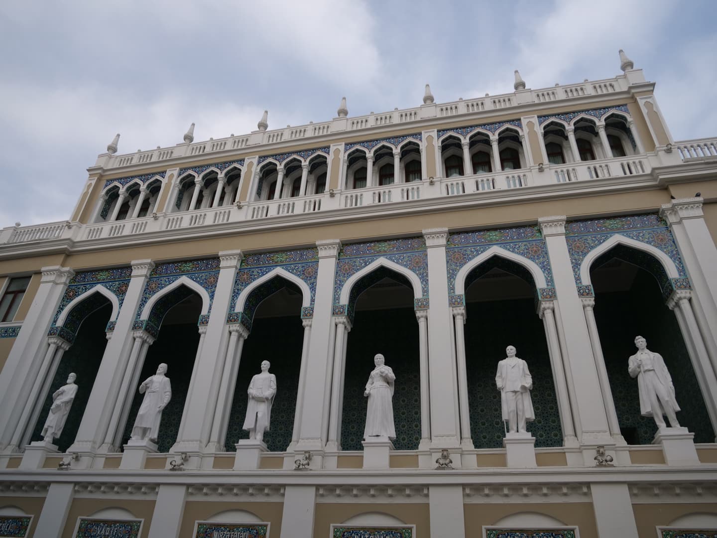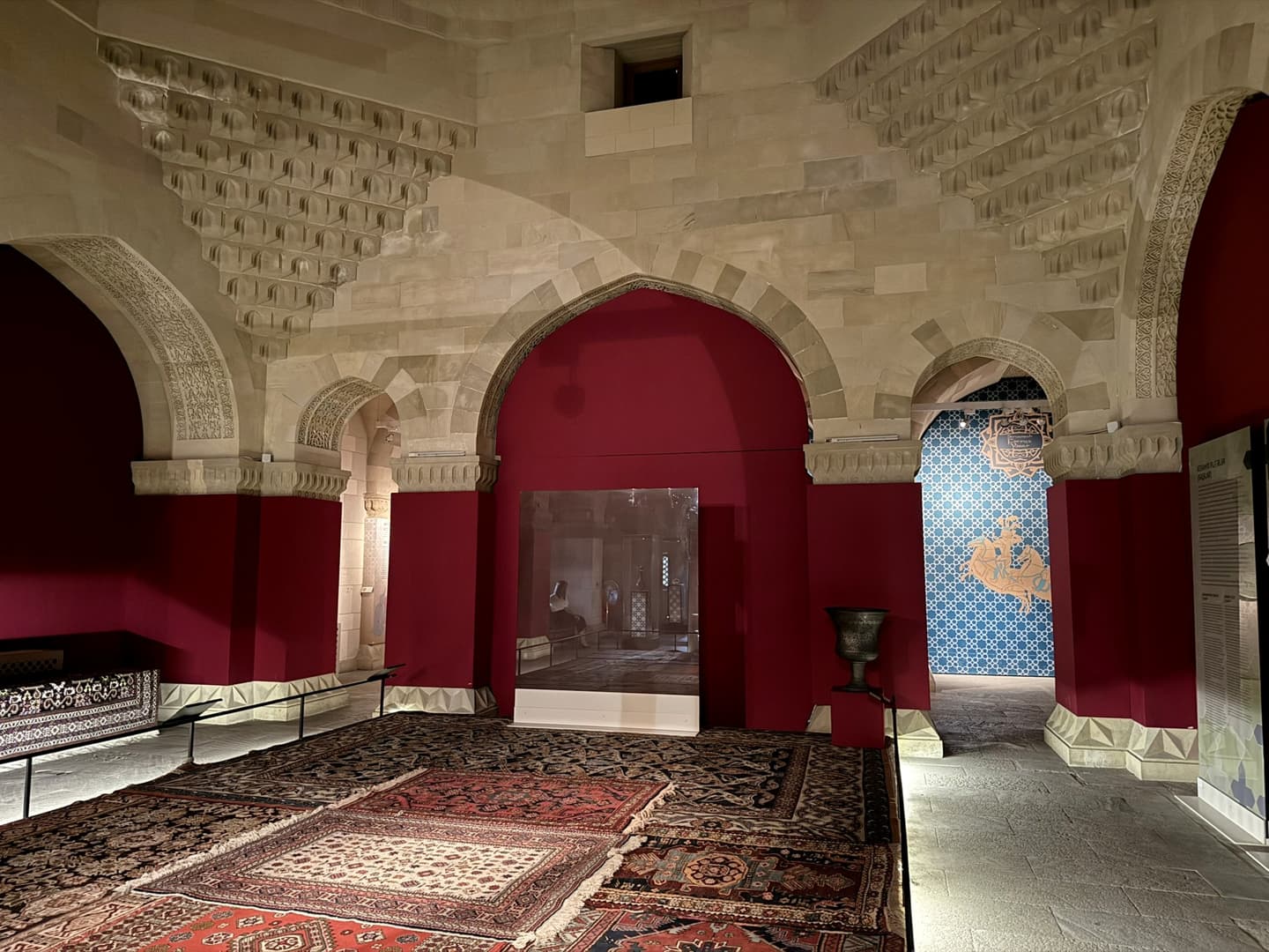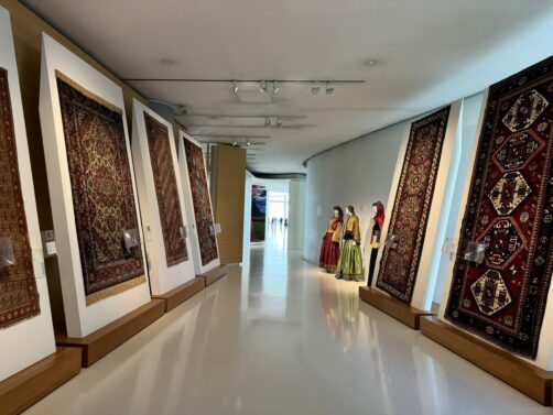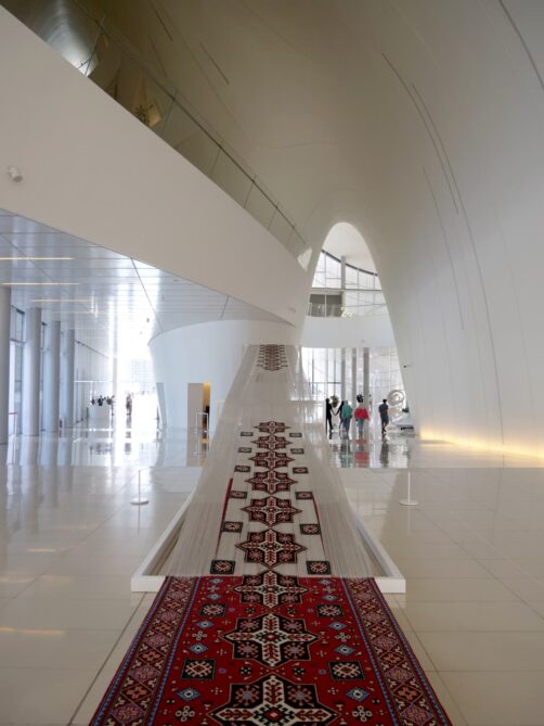 Juste en bas des escaliers, vous tomberez d’abord sur le Musée National du Tapis, dédié à l’une des grandes spécialités du pays. Vous ne pourrez pas le rater : il est en forme de tapis ! Cependant, si vous ne devez visiter qu’un musée à Bakou, je vous recommande plutôt le Centre Heydar Aliyev, qui possède également une section sur les tapis (mais dont les collections sont bien plus vastes).