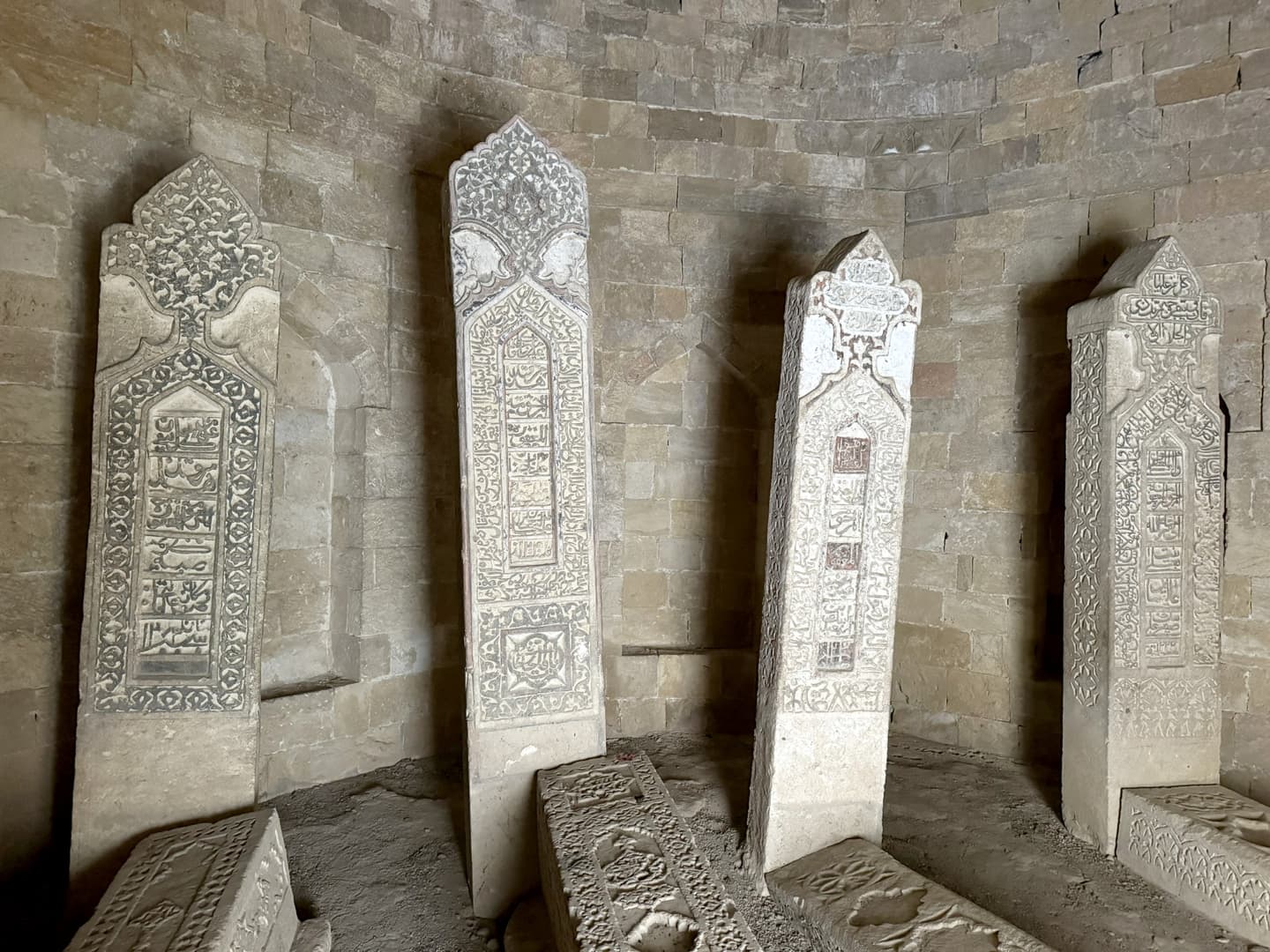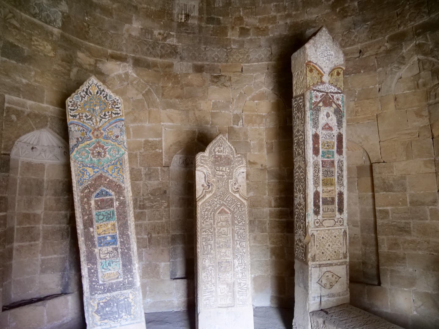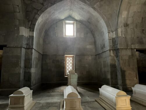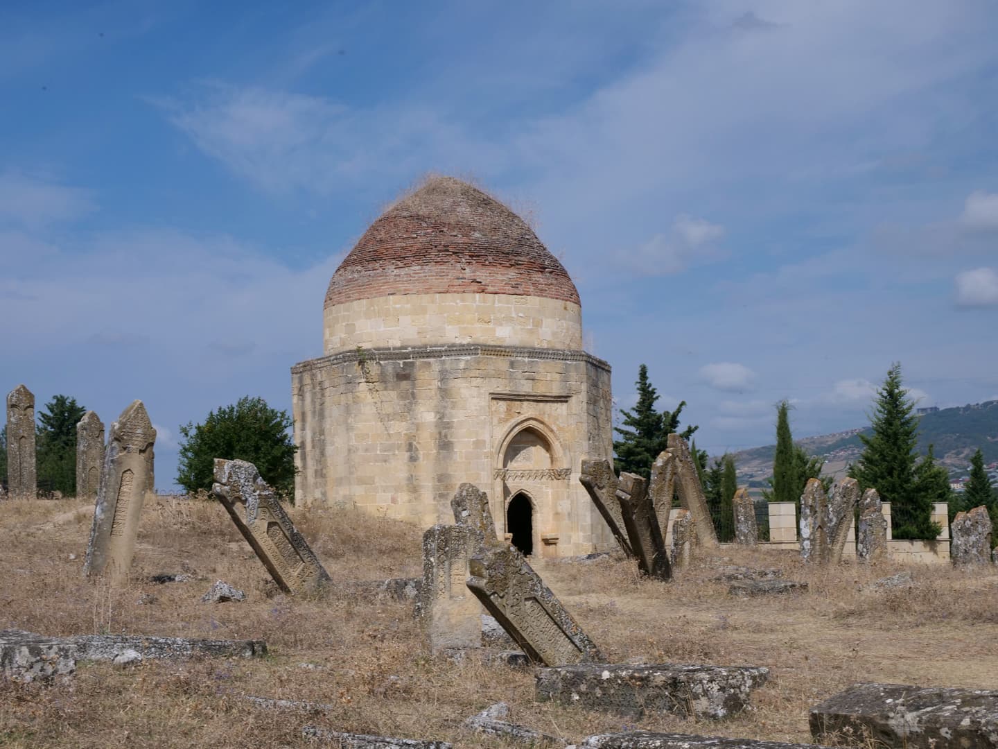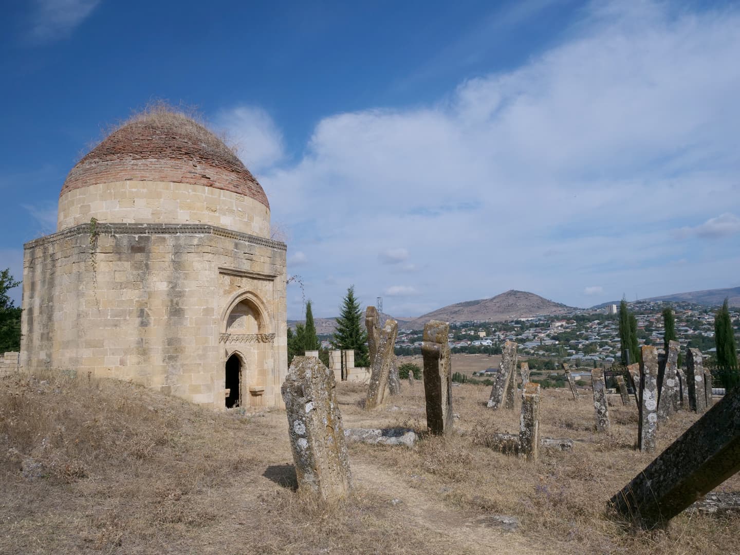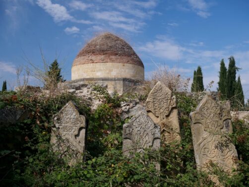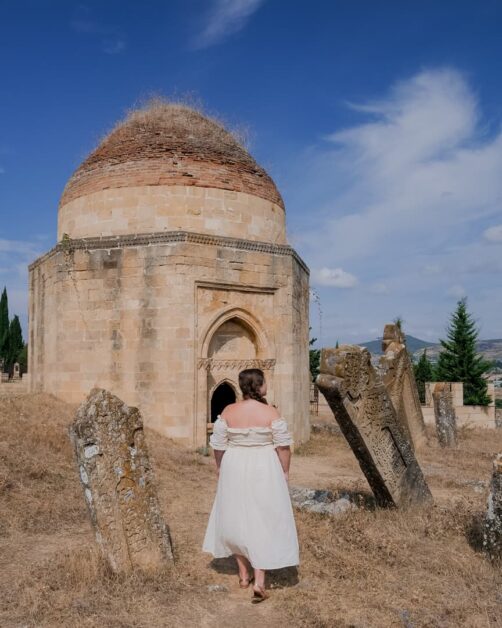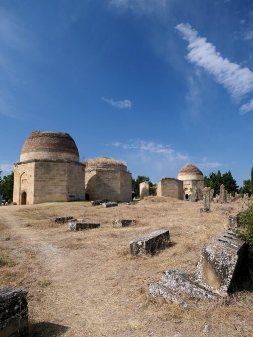 Dans les hauteurs de Shamakhi, il faut également explorer le Mausolée Yeddi Gumbaz, mausolée de la famille du dernier khan de Shamakhi. Des 7 domes datant du 19ème siècle, seuls 3 sont encore entiers. A l’intérieur, quelques tombes ont gardé leurs couleurs d’origine. Ajoutez à cela la vue sur la ville, avec les montagnes en arrière-plan : un de mes endroits préférés du voyage !