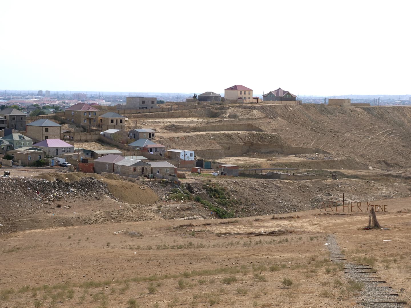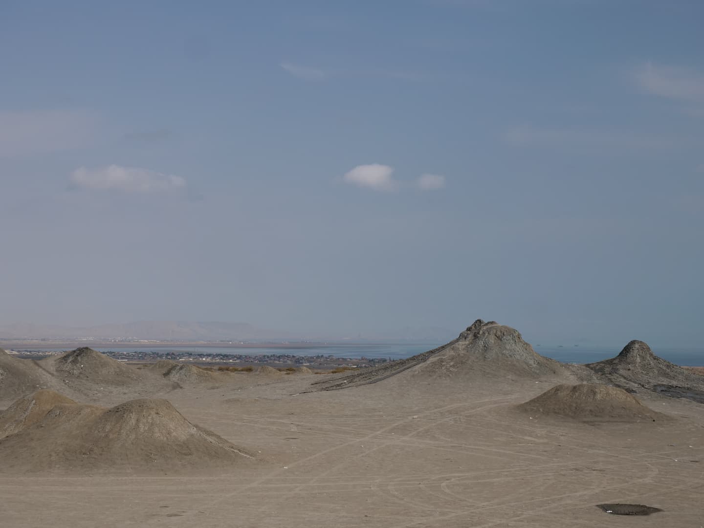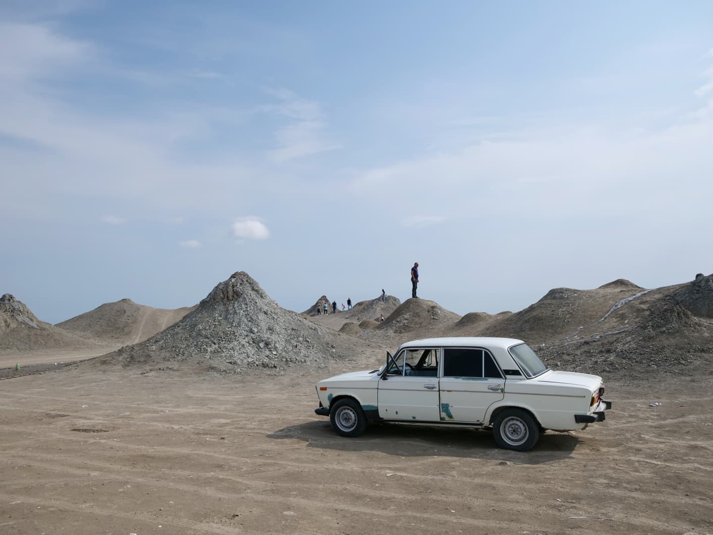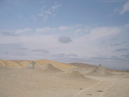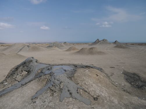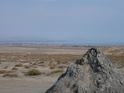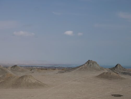 Après avoir traversé des étendues désertiques, l’arrivée dans la zone des volcans est surprenante : déjà, ils sont bien plus petits que ce qu’il n’y parait en photos, et sont vraiment concentrés dans de petites zones ! Avec la mer Caspienne en arrière-plan, le cadre est vraiment particulier. Ces volcans sont eux aussi du à la présence en quantité de gaz naturel sous la terre, qui vont expulser la boue en remontant à la surface.