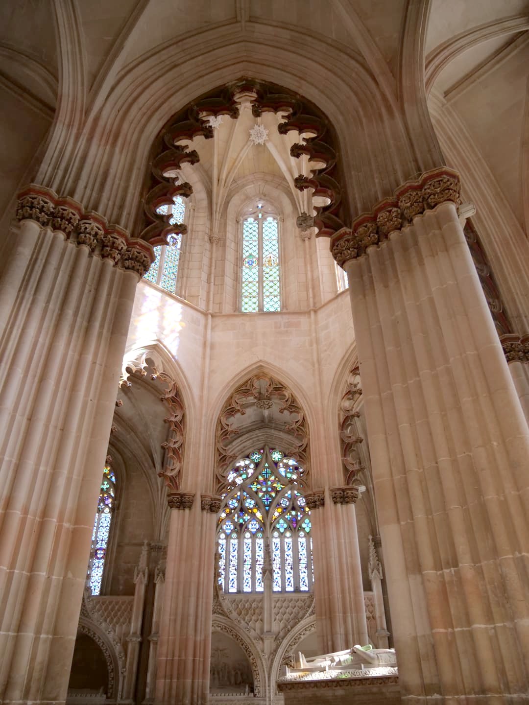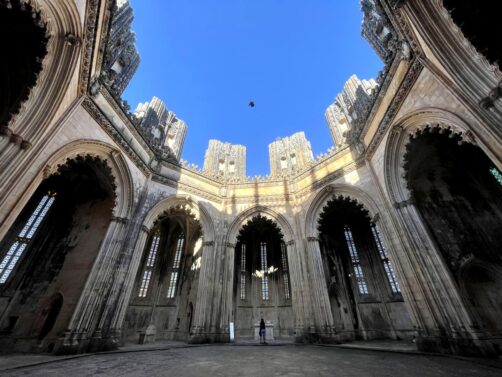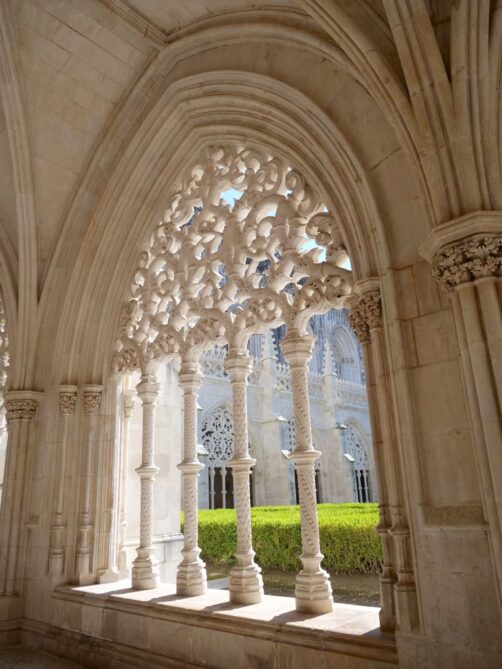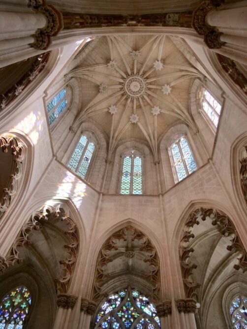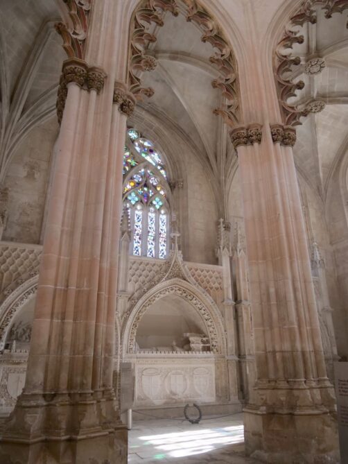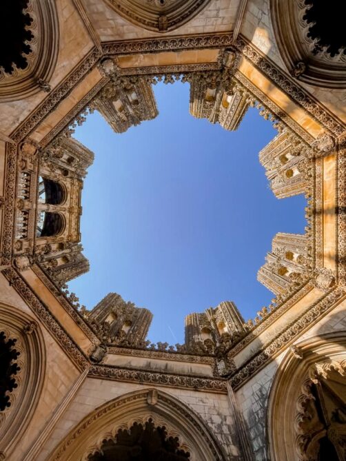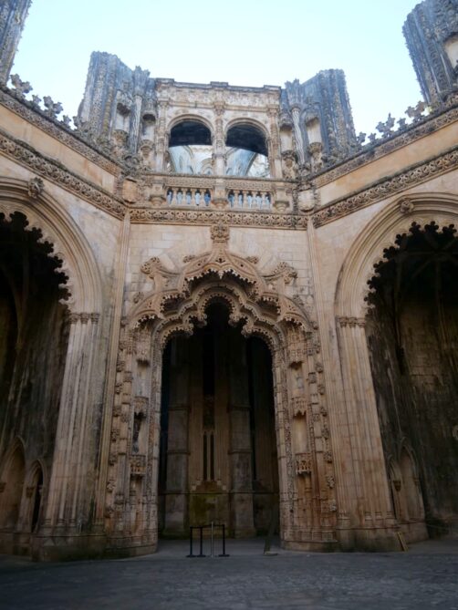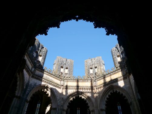 Le Monastère de Batalha est particulièrement célèbre pour ses Chapelles inachevées (aussi appelées Chapelles imparfaites). À l’origine prévues pour accueillir les tombes des sept premiers rois du Portugal, leur construction a finalement été interrompue lorsque le Monastère de Jeronimos à Belem (Lisbonne) a finalement été choisi pour ce rôle. Aujourd’hui, ces chapelles aux détails raffinés, représentatifs des styles manuélin et gothique flamboyant, sont toujours à l’air libre ! Le cadre est magique et vraiment insolite.