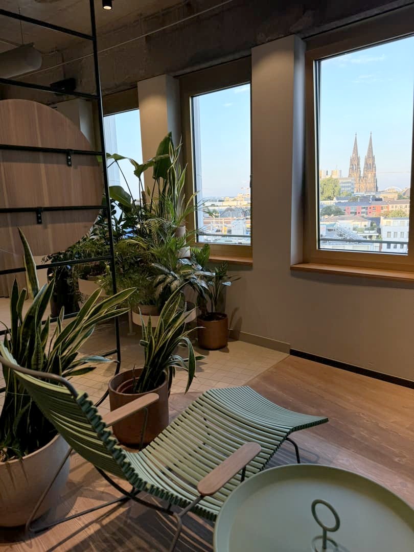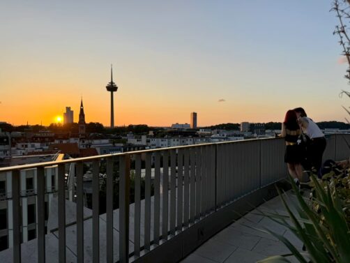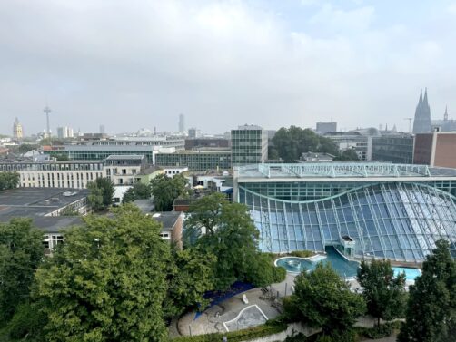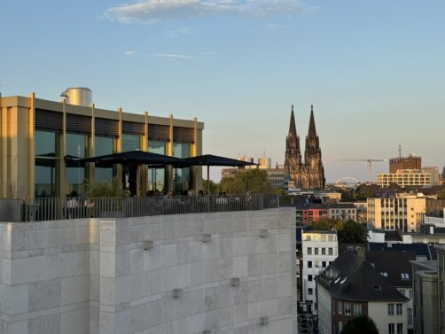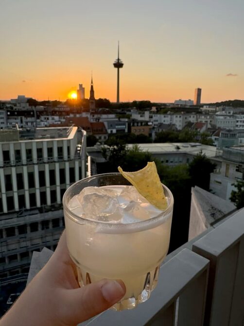 L’hôtel dispose aussi d’un très bel espace spa, dont l’espace de relaxation offre une jolie vue sur la Cathédrale de Cologne. Vous trouverez aussi sur place un restaurant (avec aussi vue sur la cathédrale) et un rooftop bar, le Monkey Bar, où j’ai été profiter du coucher du soleil. La terrasse du bar fait face au coucher du soleil et à la tour Colonius. C’est un endroit très populaire lorsqu’il fait beau, et j’ai vite compris pourquoi car le cadre est vraiment sympa et les cocktails sont plutôt réussis. Bref, si vous cherchez une adresse tendance avec de bonnes options pour manger ou boire un verre sur place, c’est l’endroit parfait !
