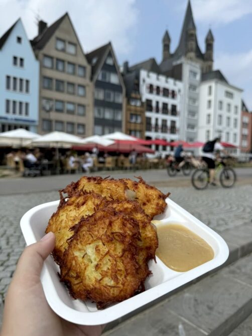 Adresse recommandée par la guide de mon « beer tour », le Rievkoochebud est l’un des secrets bien gardés de Cologne, où l’on mange sur le pouce les meilleures galettes de pommes de terre de l’univers ! Les « Reibekuchen », ces croustillantes galettes de pommes de terre râpées, sont également l’une des grandes spécialités de la région de Cologne. Ce petit restaurant de take-away situé au coeur de la vieille ville, très populaire auprès des locaux, permet de les déguster de manière traditionnelle, avec de la compote de pommes (mais pour ceux qui préfèrent, d’autres accompagnements sont aussi possibles, comme du saumon fumé ou du fromage).