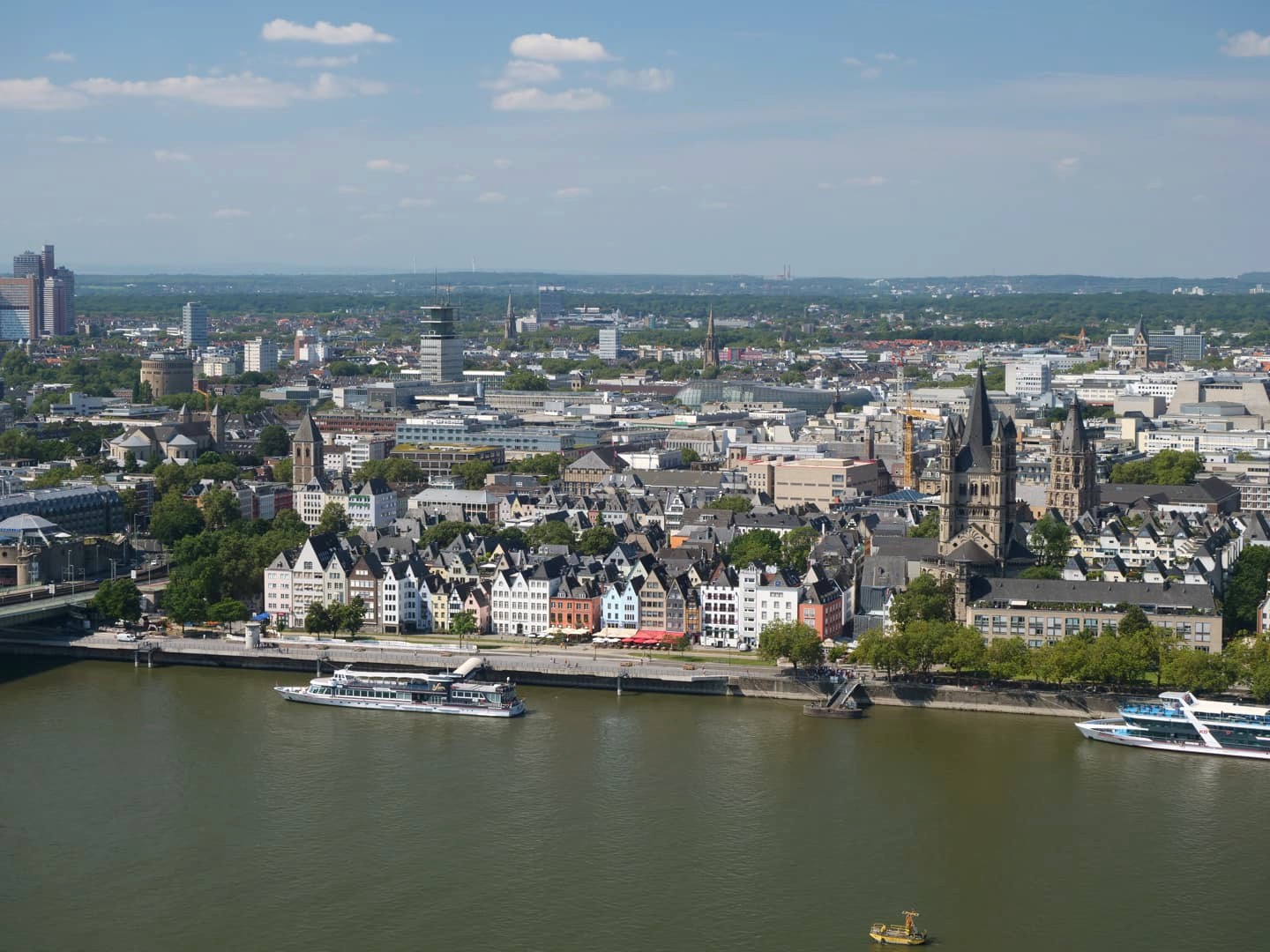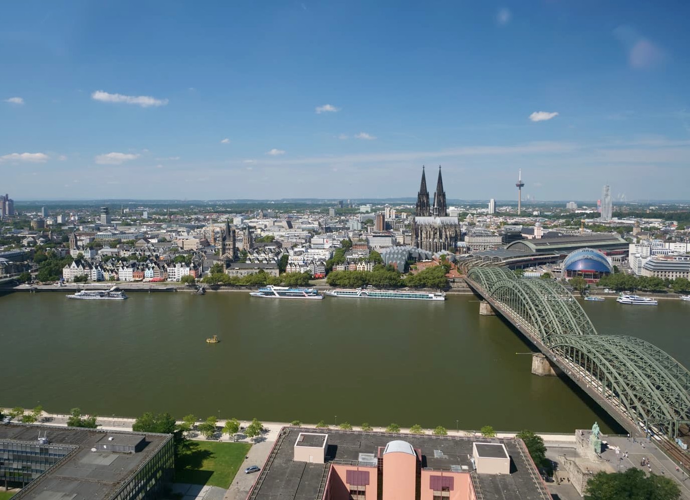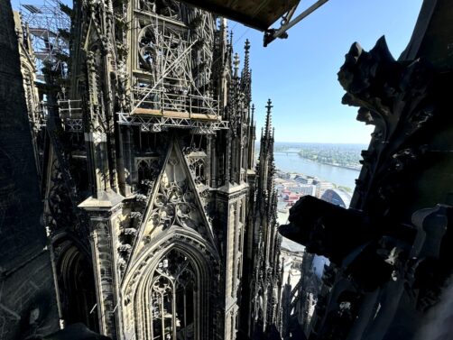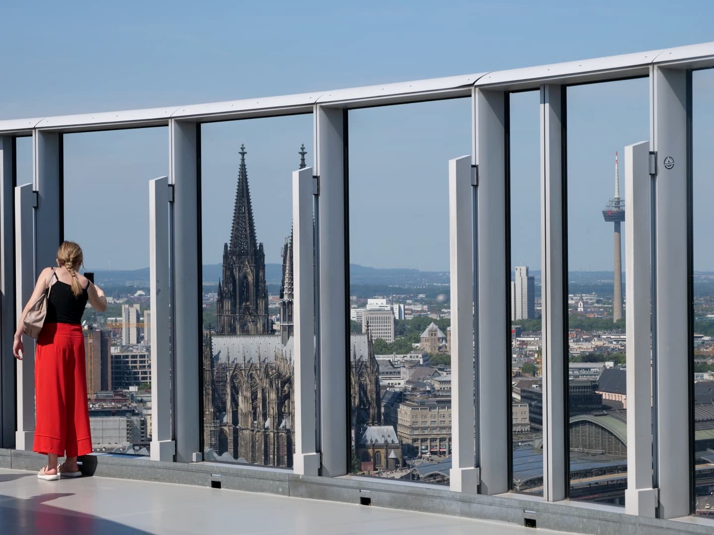 Face à la Cathédrale de Cologne, de l’autre côté du Rhin, se dresse une grande tour contemporaine au sommet de laquelle se trouve une plateforme d’observation panoramique; à plus de 100 mètres de hauteur. C’est pour moi le plus beau panorama sur la ville, puisqu’il permet de voir également la cathédrale. L’accès à cette plateforme payante se fait rapidement par ascenseur. En saison, il y a un petit bar ouvert au sommet.