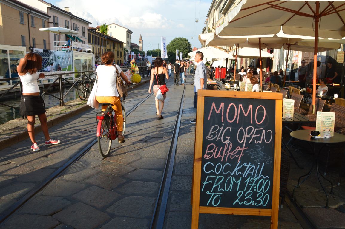 L’endroit le plus animé pour prendre un apéritif est le quartier des Navigli, les canaux de Milan (attention aux moustiques!). Situé au sud de la ville, c’est vraiment le quartier le plus festif de Milan. Nous avons pris l’apéro le long d’un canal, chez Momo (Ripa di Ticinese 23), un des bars les plus réputés pour l’apéro. En plus, lors de notre visite, c’était la Coupe du Monde de foot, et l’Italie jouait justement ce soir-là. Je ne vous parle même pas de l’ambiance qu’il y avait, avec écran-géants, terrains de foot sur l’eau, et tutti quanti !