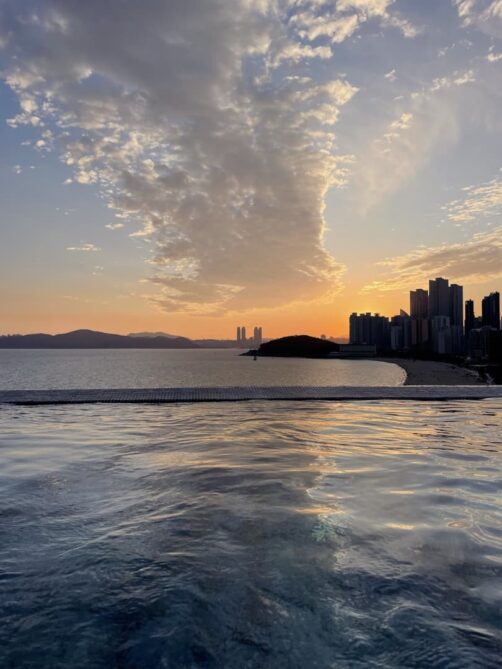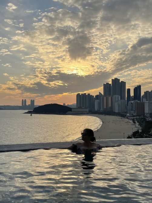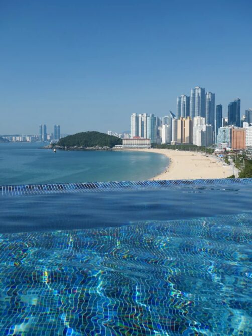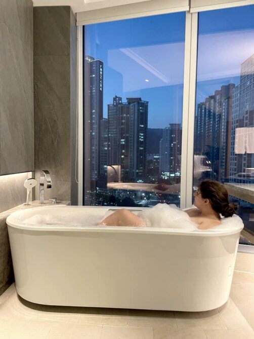 Hôtel : 1 ou 2 nuits au Signiel Busan (voir plus de photos et les tarifs actuels ici) : l’un des plus beaux hôtels de Corée du Sud, avec une piscine panoramique avec vue sur la plage de Hueandae et une chambre incroyable avec un bain avec vue sur la ville. Un endroit vraiment incroyable, si bien que l’on a décidé d’y passer une bonne partie de l’après-midi plutôt que de continuer nos explorations. Et parfois ça fait vraiment du bien ! L’hôtel se trouve dans la LCT Tower, l’un des plus hauts buildings de Corée du Sud, où se trouve aussi une plateforme d’observation au 100ème étage, Busan Haeundae X the Sky.