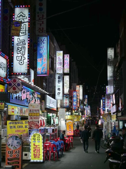 Nous avons passé notre première soirée à Busan dans le quartier de Nampo-dong, le centre-ville particulièrement animé en soirée. Après avoir mangé un repas de Hoe (poisson cru, l’une des spécialités de Busan) à côté du Jagalchi Market (le grand marché aux poissons de la ville), nous nous sommes baladés dans le quartier Busan International Film Festival et au Bupyeong Kkangtong Night Market.
