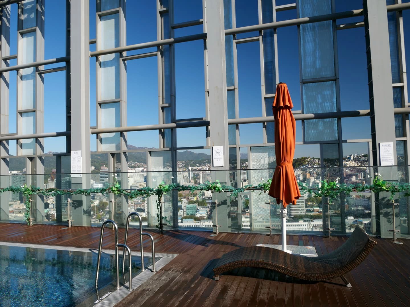 Hôtel : 2 nuits au Novotel Ambassador Seoul Dongdaemum Hotel (voir plus de photos et les tarifs actuels ici) : un hôtel moderne vraiment bien situé et avec une superbe piscine sur le toit chauffée, avec vue sur la ville. Nous avons eu un upgrade dans un véritablement petit appartement méga spacieux.