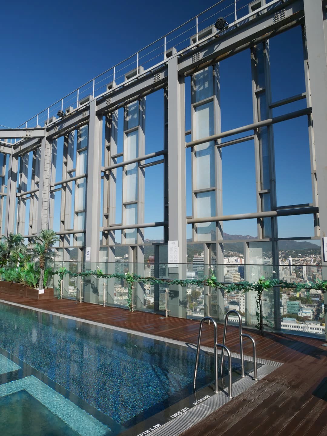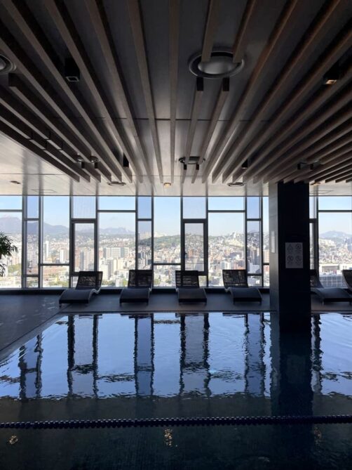 L’autre grand avantage de cet hôtel (et l’une des raisons principales pour lesquelles je l’avais choisi, outre sa localisation pratique, je l’avoue), c’est son espace piscine ! On y trouve à la fois une grande piscine intérieure et une superbe rooftop pool extérieure chauffée, avec une vue panoramique sur Séoul. La température était parfaite et comme il faut réserver un créneau à l’avance, j’y étais seule ! Et la température de l’eau était vraiment parfaite, en plus de tout.