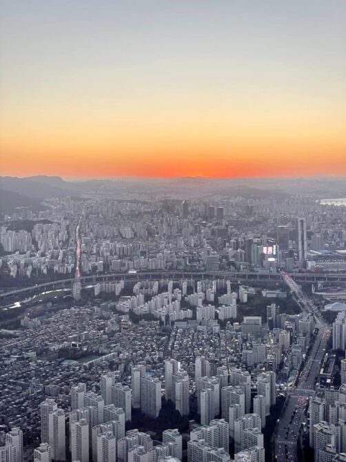 L’observatoire Seoul Sky au sommet de la Lotte World Tower vous permet de profiter de la vue panoramique depuis le 6ème plus haut bâtiment au monde, et le plus haut de Corée du Sud. La plateforme d’observation est principalement en intérieur et toute vitrée, ce qui est un peu le désavantage de l’endroit, surtout que c’est assez étroit.