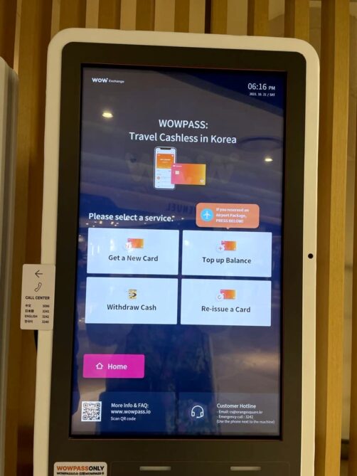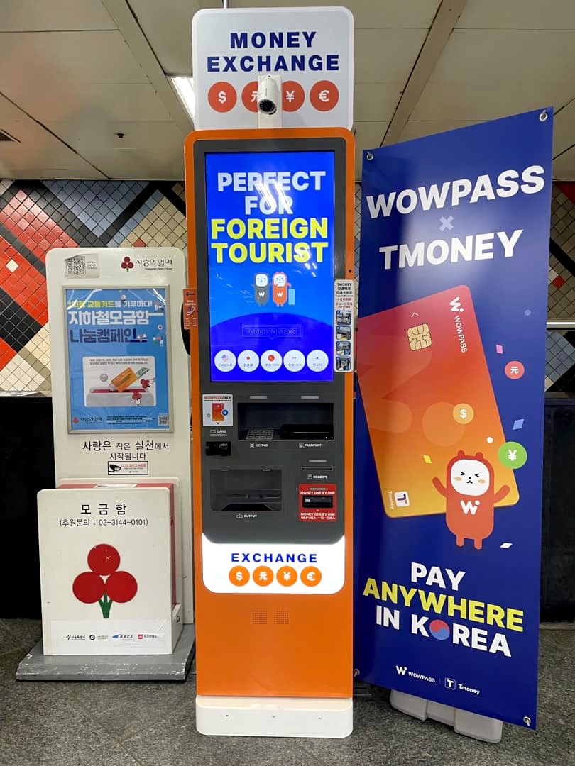 Il y a des machines un peu partout en ville pour charger ou recharger la carte, notamment dans certaines stations de métro et dans des hôtels (téléchargez l’app Wowpass sur votre téléphone pour avoir accès à toutes ces infos). Les machines Wowpass sont très simples à utiliser, il suffit de suivre les instructions à l’écran (disponibles en plusieurs langues). Une fois la carte chargée, on peut aussi faire des retraits de liquide en won (avec des frais de retrait, mais faibles). C’est pratique car certains endroits ne prennent que le cash.