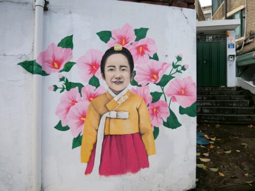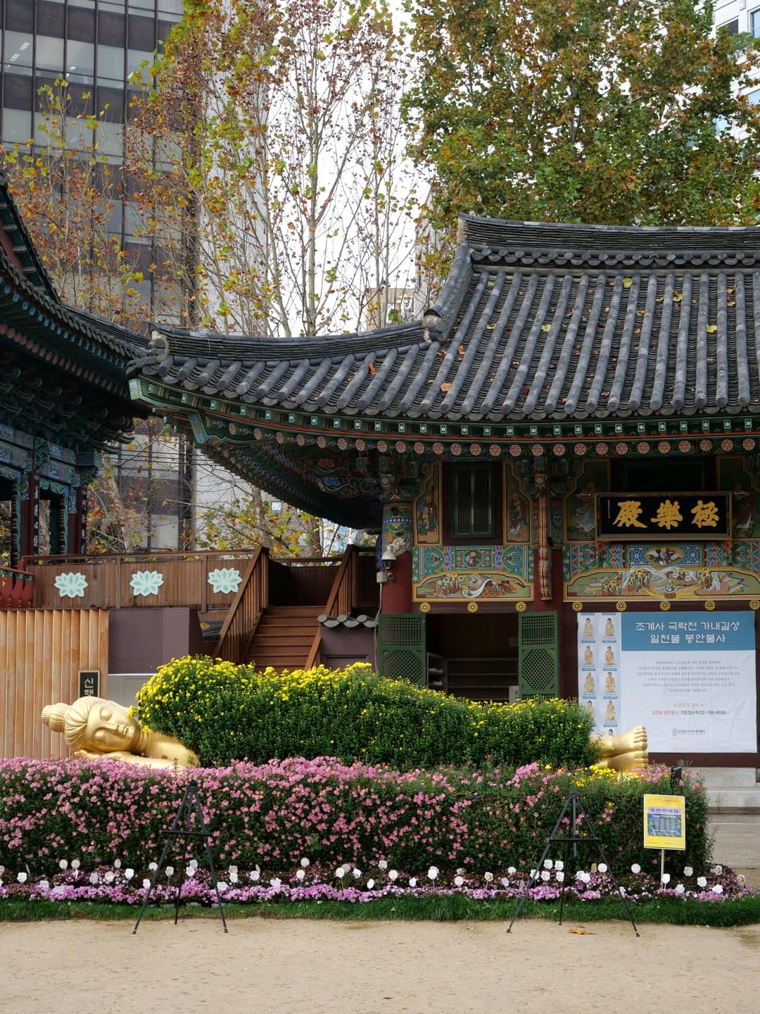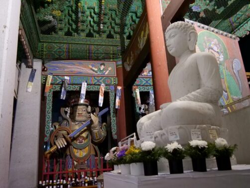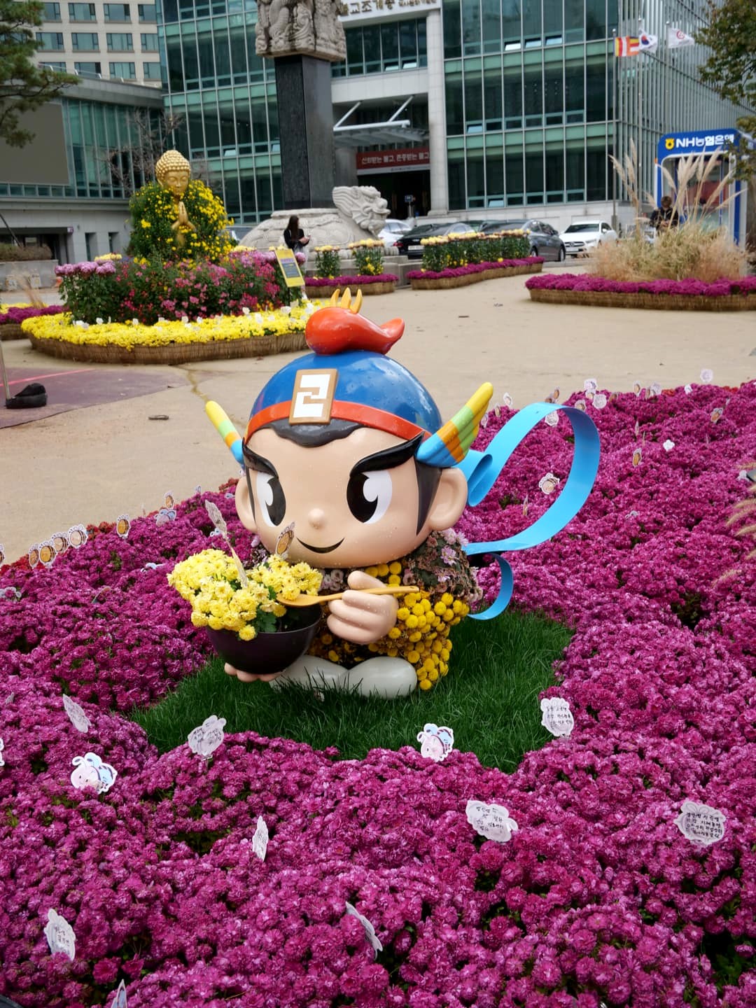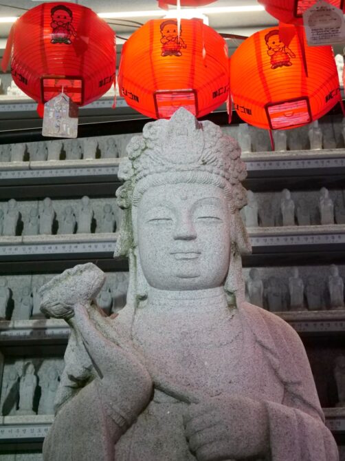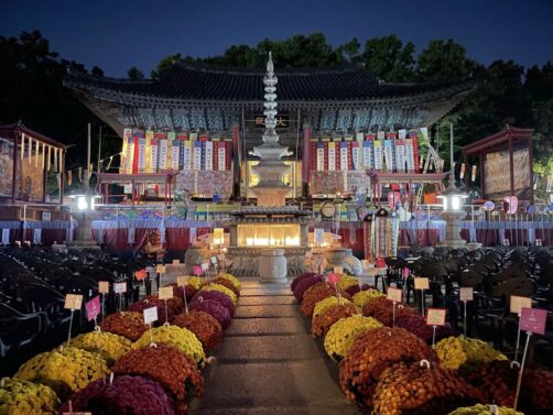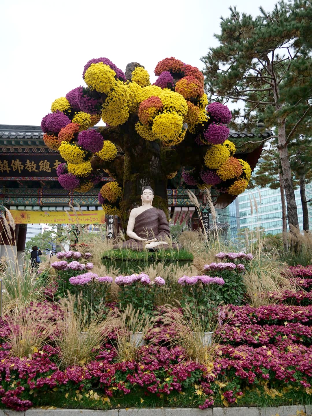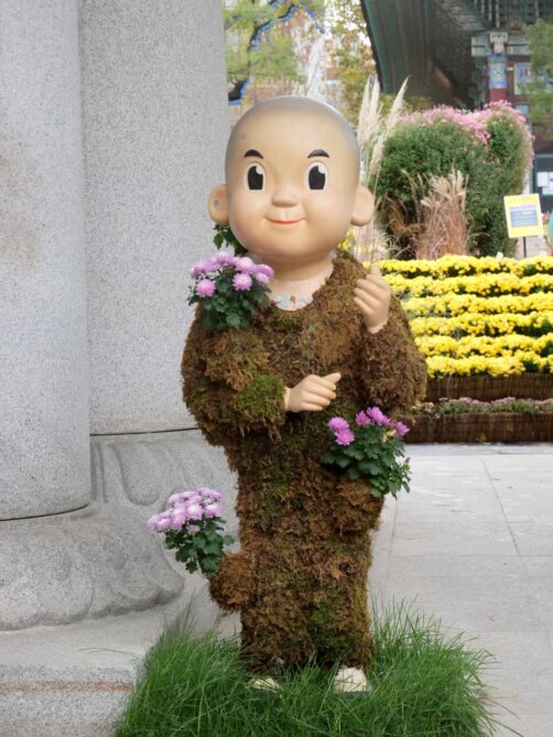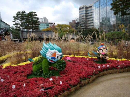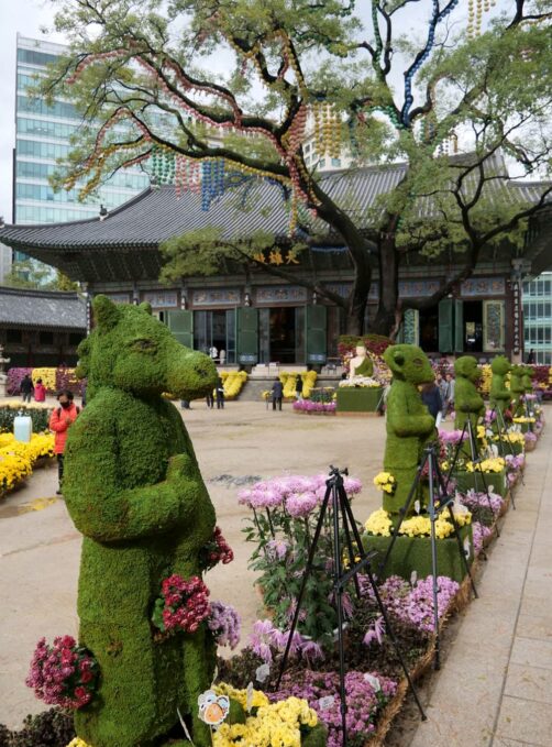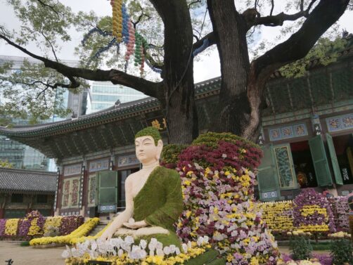 C’est aussi dans ce quartier que se trouve le Jogyesa Temple, le temple principal du bouddhisme zen coréen. En novembre, nous avons eu la surprise de découvrir le temple garni de statues en fleurs, dans le cadre d’un festival. C’était magnifique !