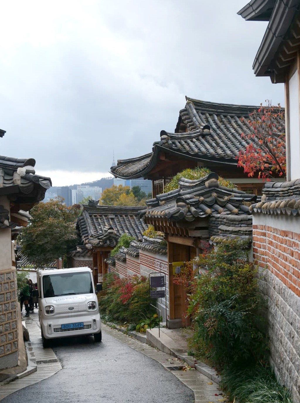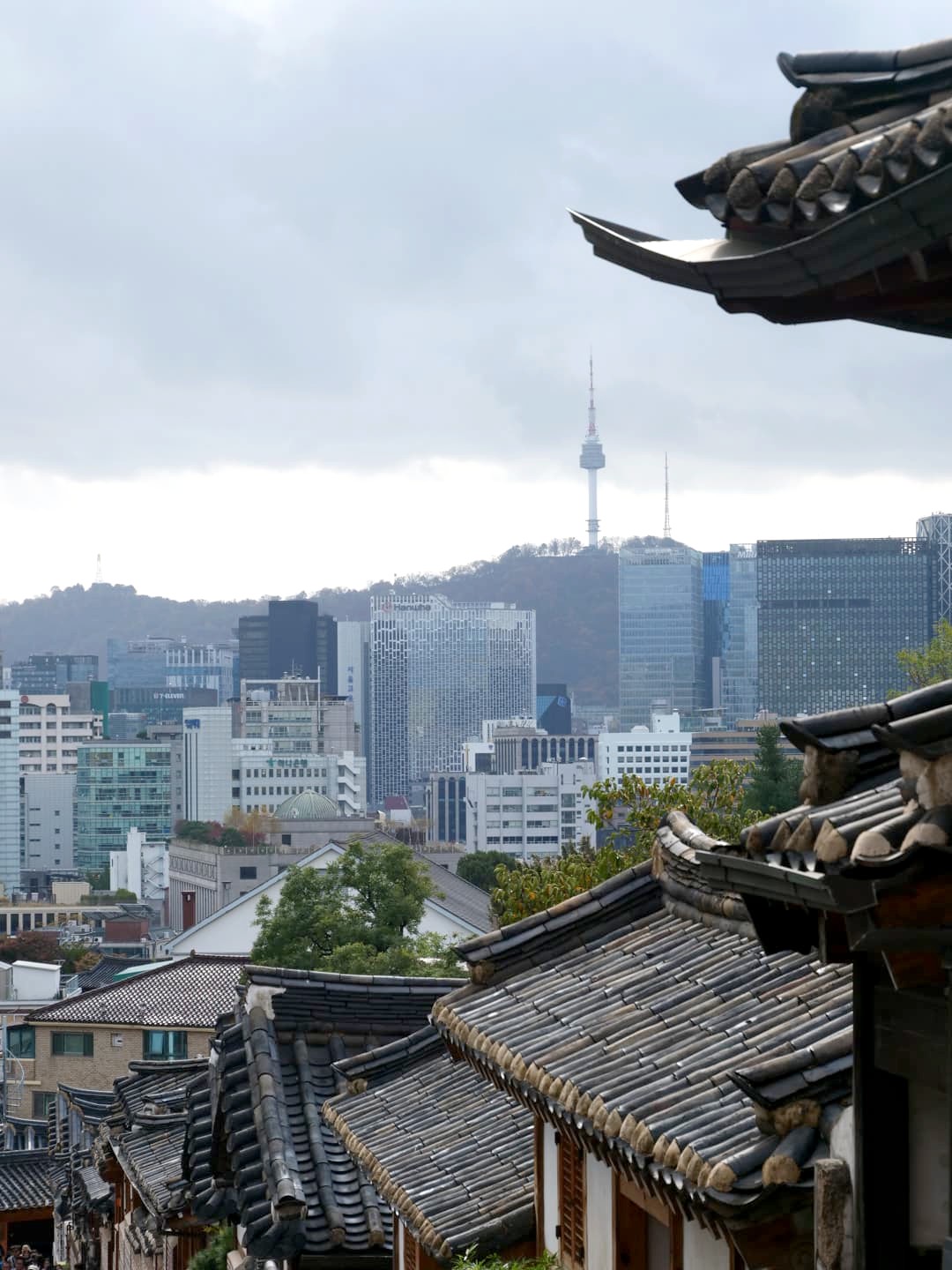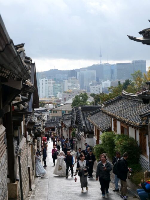 Situé entre les palais Gyeongbokgung et Changdeokgung, le Bukchon Hanok Village est le Hanok village le plus touristique de Séoul. Même si ce quartier est sans doute le mieux préservé de la ville, il perd pour moi tout son charme avec les hordes de touristes. On a fait la photo souvenir, puis on est vite partis… Et pourtant nous y étions un matin pluvieux, en plein semaine, en novembre, donc loin d’être la haute saison !