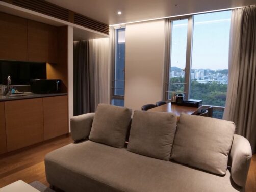 La particularité de cet hébergement est qu’il possède une partie hôtel classique, avec des chambres standard, et une partie « résidence » avec des appartements équipés. Nous avions réservé une chambre standard mais comme elle n’était pas prête à l’heure du check-in, nous avons finalement eu un bon upgrade avec un des appartements une chambre de la partie résidence ! C’était ultra spacieux et très luxueux, avec des toilettes japonaises (le must !), un grand espace salon et une grande cuisine équipée, une chambre séparée avec un énorme lit très confortable, une agréable salle de douche… Bref, on y était vraiment bien !