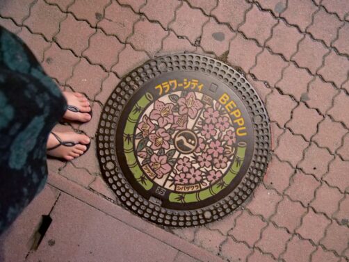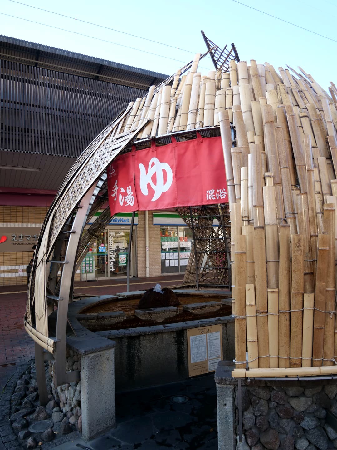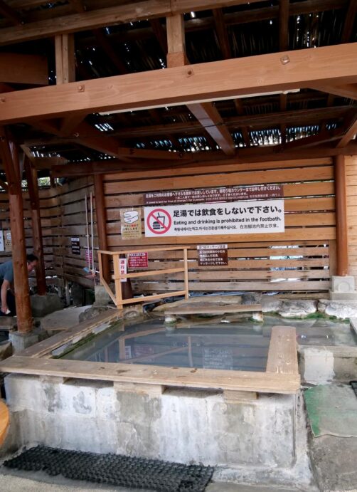 Avant d’aller voir les Enfers, nous avons d’abord découvert le centre-ville de Beppu, qui s’étend entre la gare de Beppu et la côte. Celui-ci mérite une visite rapide, même s’il est beaucoup moins animé que celui de Fukuoka. Ce qui est par contre assez sympa, c’est que l’on trouve des bains de pied (et même de mains !) accessibles gratuitement un peu partout en ville, même dans le centre commercial !