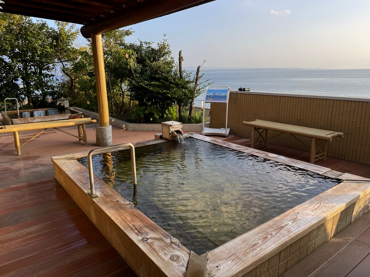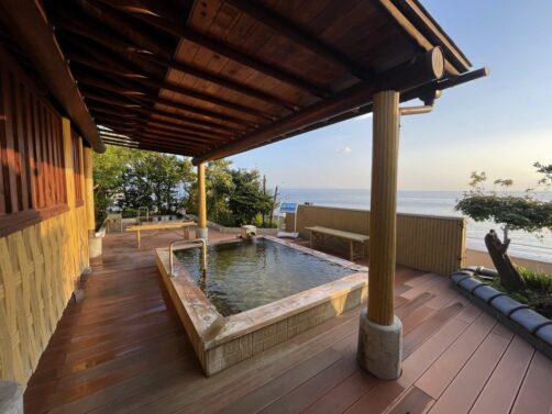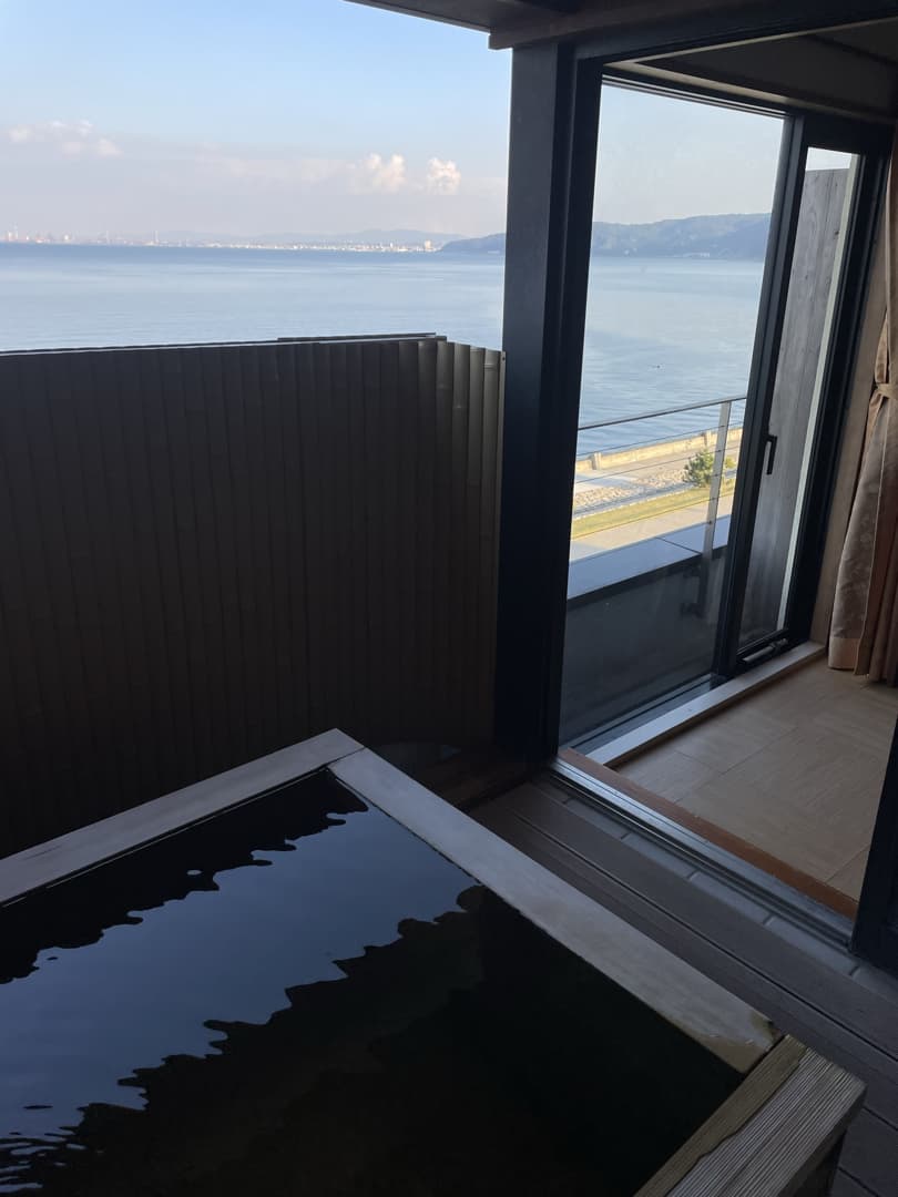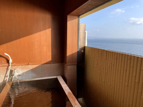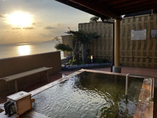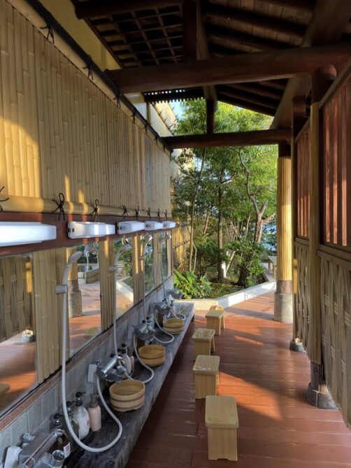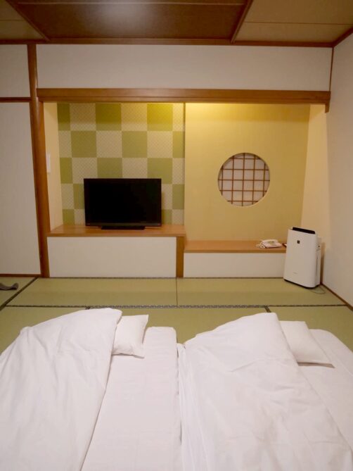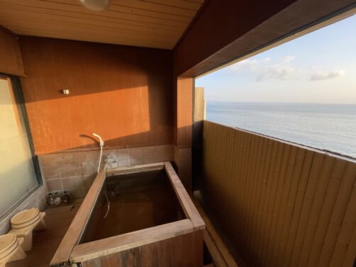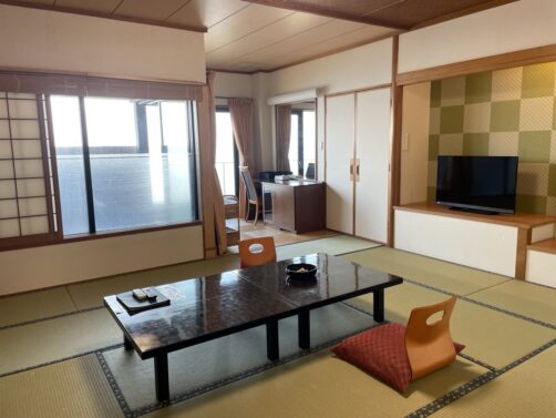 Nous avons séjourné face à la mer dans un ryokan au charme assez rétro, le Seaside Hotel Mimatsu Ooetei. Il ne paie pas de mine de l’extérieur, mais je l’ai choisi pour son excellent rapport qualité-prix ainsi que pour ses jolis bains extérieurs sur le toit, avec vue sur la mer. Ceux-ci sont séparés par sexe et sont vraiment super agréable !