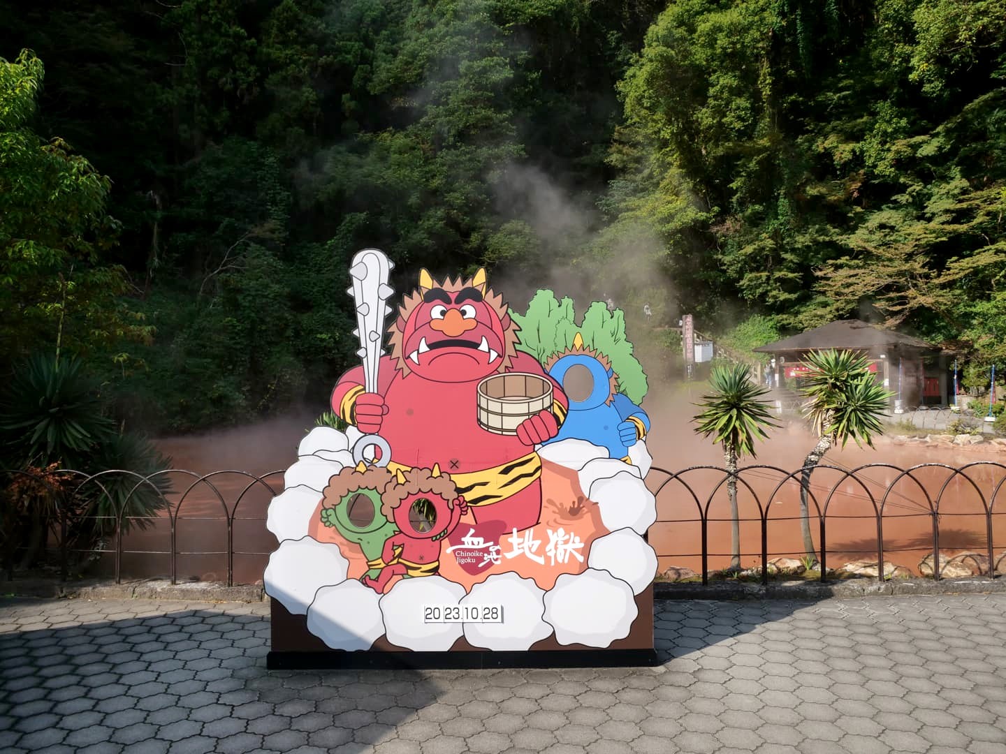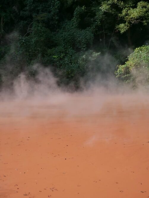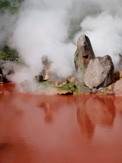Notre tournée des Enfers a débuté au Chinoike Jigoku (« l’Enfer de l’Etang de Sang »), un enfer très photogénique aux eaux rouges intenses. Avec le geyser de Tatsumaki Jigoku, il se trouve dans la plus petite zone de Kamegawa. Il doit la couleur de son eau à la présence d’argile et d’oxyde de fer. Cette composition fait que le produit le plus populaire que l’on y vend, c’est une « crème magique » sensée soigner plein de petits bobos ! C’est aussi le plus vieil Enfer de Beppu. Il y a aussi la possibilité de faire un bain de pieds (pas dans le bassin central, il est bien trop chaud).