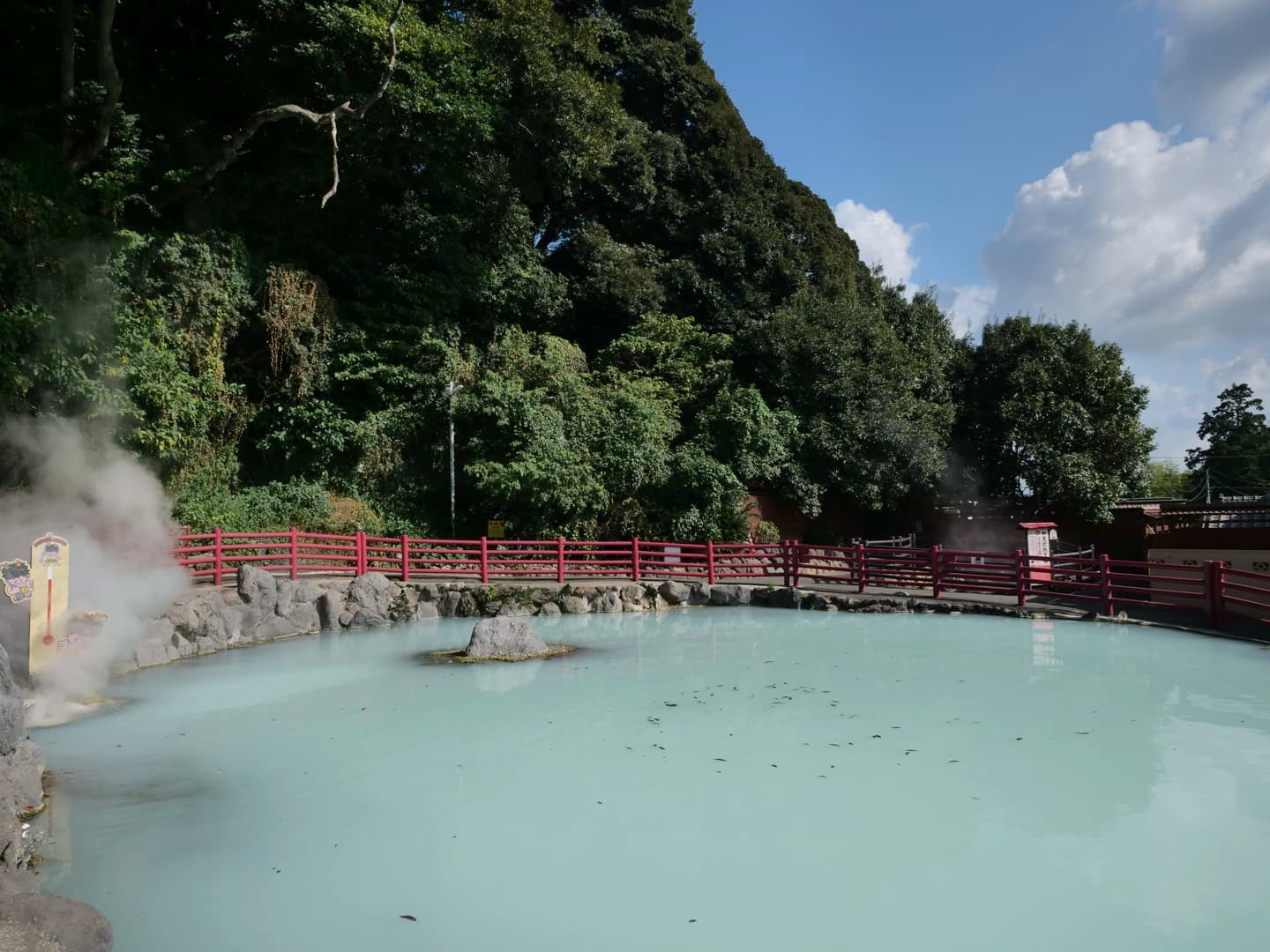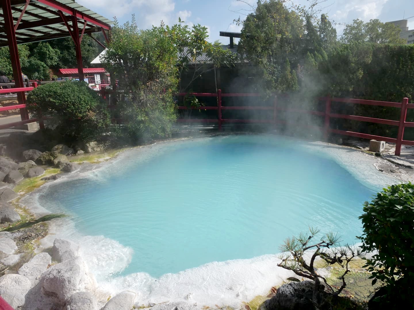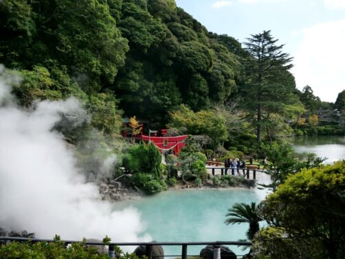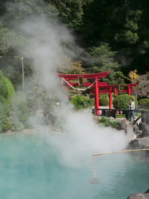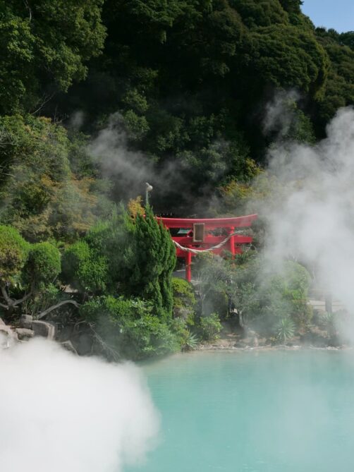 On finit en beauté avec la visite de l’Umi Jigoku (« l’Enfer de la Mer »), l’un des Enfers les plus populaires et l’on comprend vite pourquoi : le cadre est sublime. Et en plus, leur bain de pied était aussi le plus agréable. On peut notamment y découvrir une grande serre avec d’énormes nénuphars, et il y a aussi un petit temple avec des torii, qui font face à un bassin au bleu intense.