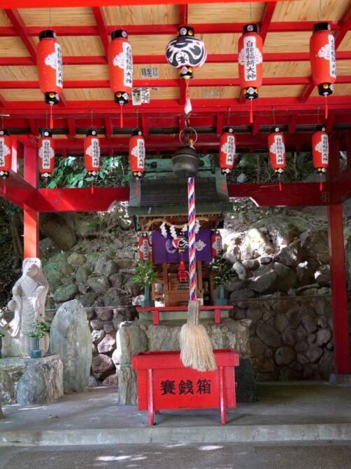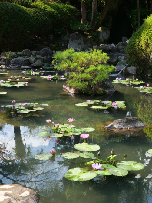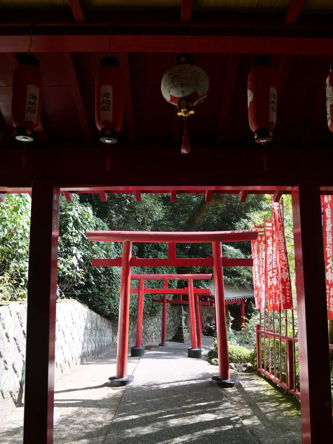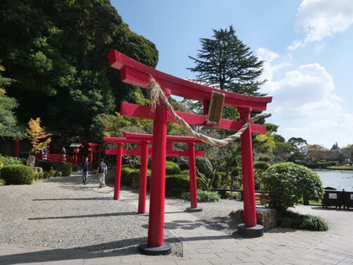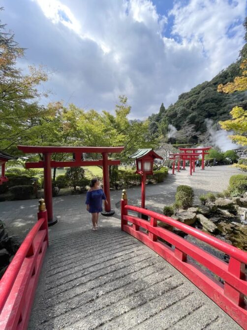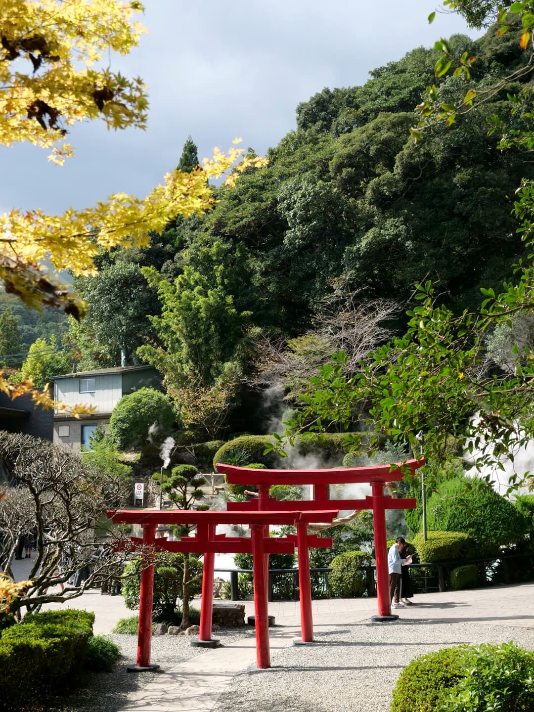 On finit en beauté avec la visite de l’Umi Jigoku (« l’Enfer de la Mer »), l’un des Enfers les plus populaires et l’on comprend vite pourquoi : le cadre est sublime. Et en plus, leur bain de pied était aussi le plus agréable. On peut notamment y découvrir une grande serre avec d’énormes nénuphars, et il y a aussi un petit temple avec des torii, qui font face à un bassin au bleu intense.
