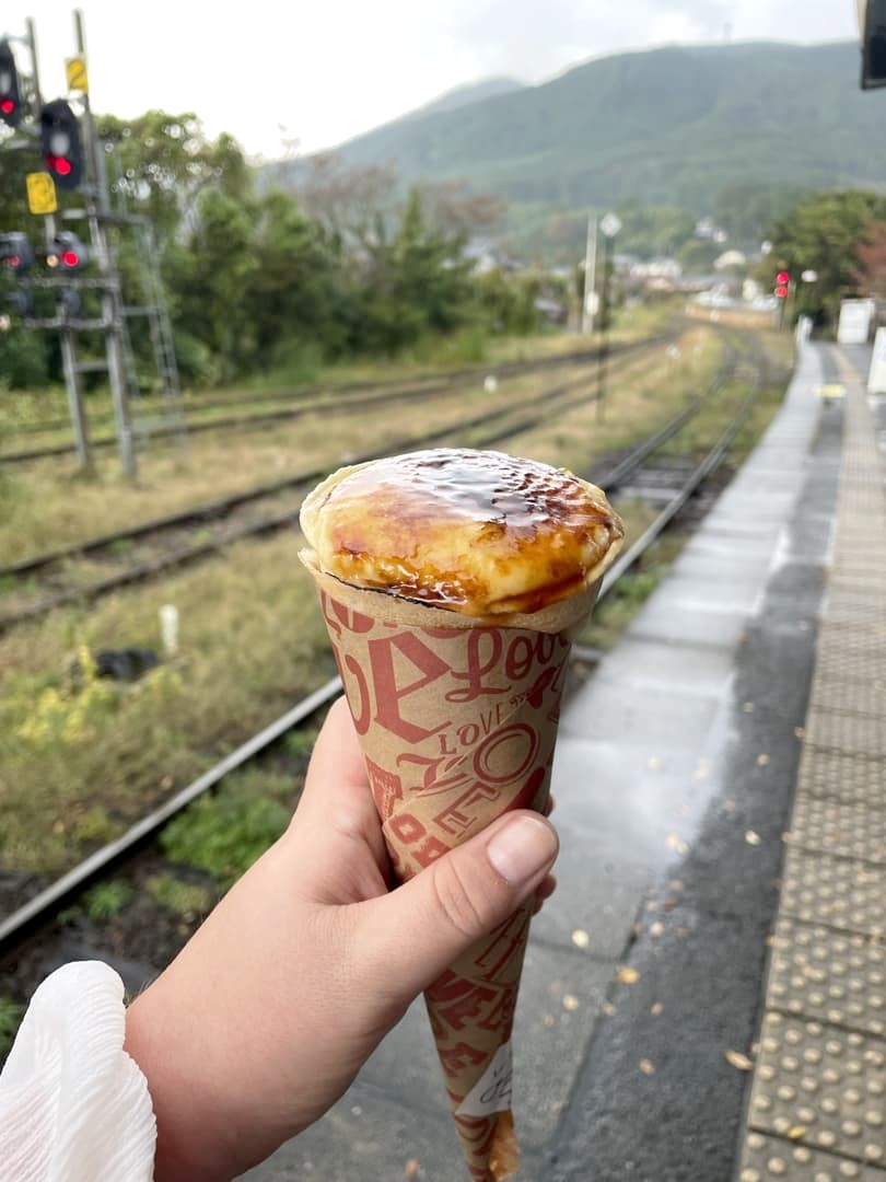 Sauf que… tous les deux, nous nous sommes fait carrément happer par les magasins de Yufuin ! Le shopping au Japon, c’est mon autre péché mignon (alors que je n’en fait quasiment jamais ailleurs), et j’ai rarement vu une aussi belle concentration de petits magasins, des plus traditionnels (avec plein de produits locaux de qualité) aux plus « kawaii ». On y a fait nos meilleures trouvailles de ce voyage, avec des prix toujours très corrects. Ajoutez à cela plein de possibilités de street food et autres petites restaurations « kawaii »… Finalement, on y a passé tout notre temps (surtout lorsque l’on a découvert que le dernier train rapide vers Beppu était plus tôt que ce que j’avais pensé !).