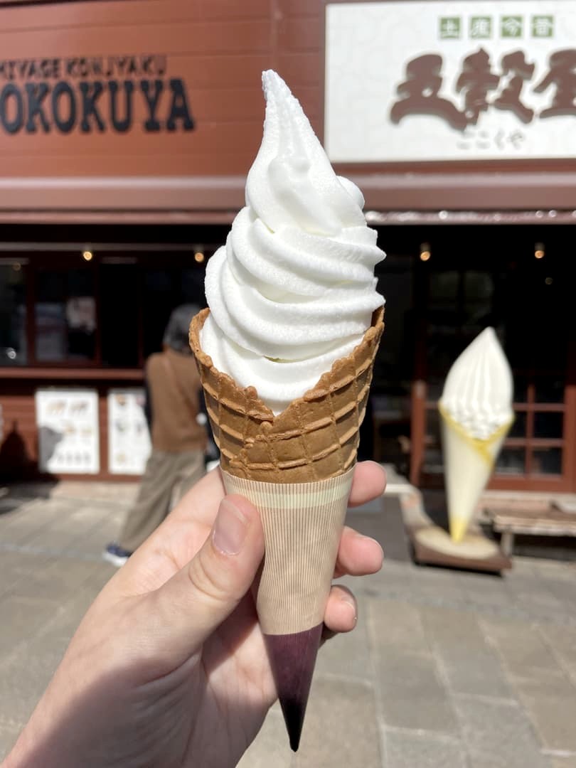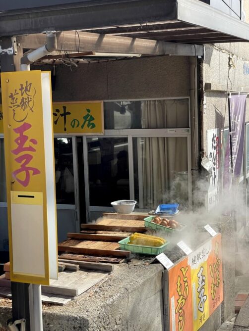 En chemin depuis l’arrêt de bus qui se trouve en bas de la zone principale, vous passerez par une rue avec plusieurs magasins et petits restaurants, dont certains servent des plats préparés en utilisant la vapeur produite par la géothermie. J’y ai aussi trouvé un chouette endroit pour manger une bonne glace, Gokokuya – leur glace au kabosu (un des agrumes locaux) était excellente. Il y a aussi de la petite restauration dans certains Enfers.