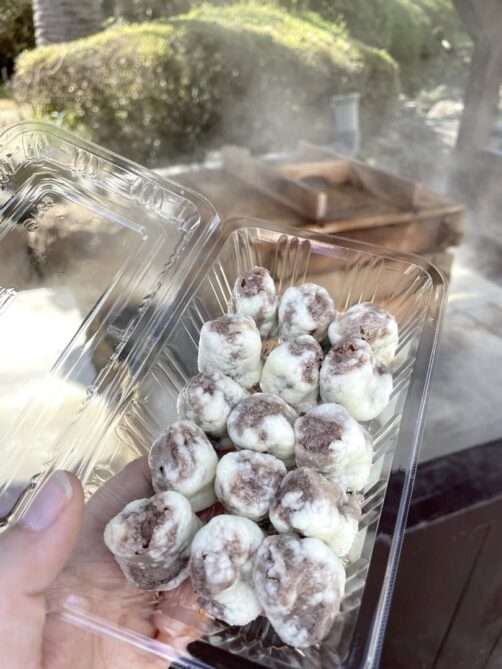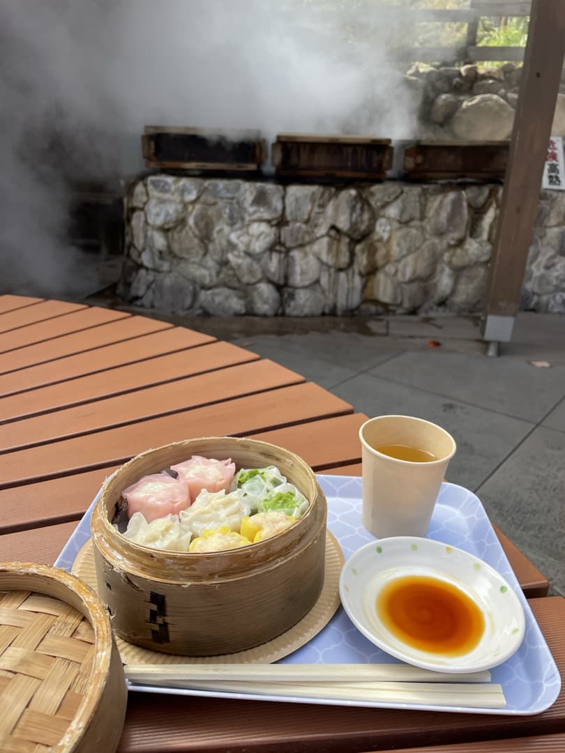 Cet enfer a une spécialité culinaire qui est apparemment très connue auprès des japonais, il s’agit d’une sorte de mini dumplings sucrés chauffés à la vapeur des sources chaudes. A la sortie de cet Enfer, vous trouverez également un petit restaurant où l’on peut manger différents plats traditionnels également cuits à la chaleur géothermique, et aux prix très abordables.