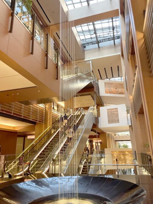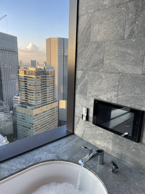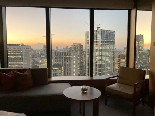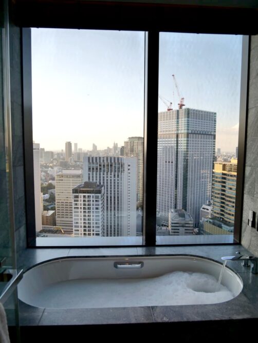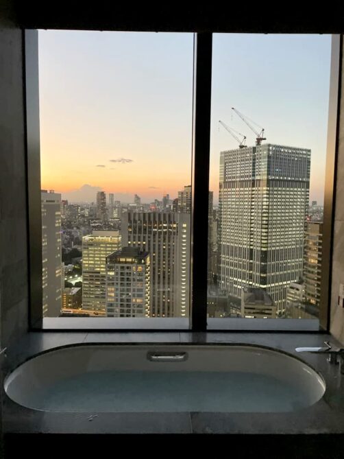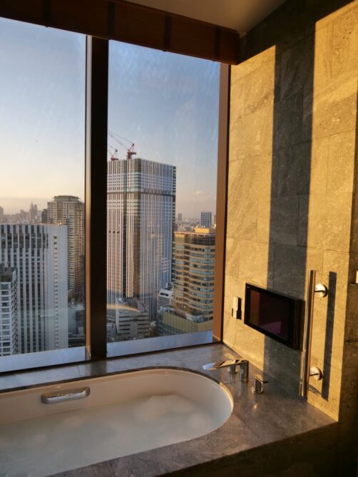 Roppongi et les quartiers voisins possèdent certains des plus beaux hôtels de Tokyo. Pour ce retour à Tokyo, j’avais envie de me faire plaisir avec une nuit dans l’un de ceux-ci, pour me croire un peu dans « Lost in Translation » ! Ce que je visais surtout, c’était un bain avec vue sur la ville et j’ai eu le bonheur de trouver une super promo à The Okura Tokyo, qui en plus d’être l’un des plus beaux hôtels où j’ai séjourné, avait aussi un petit côté vintage comme j’aime (les parties communes font très sixties). C’était vraiment un coup de bol de pouvoir se payer une de ces chambres à ce prix-là (il faut remercier les prix post-pandémie), et j’en garde un souvenir inoubliable.