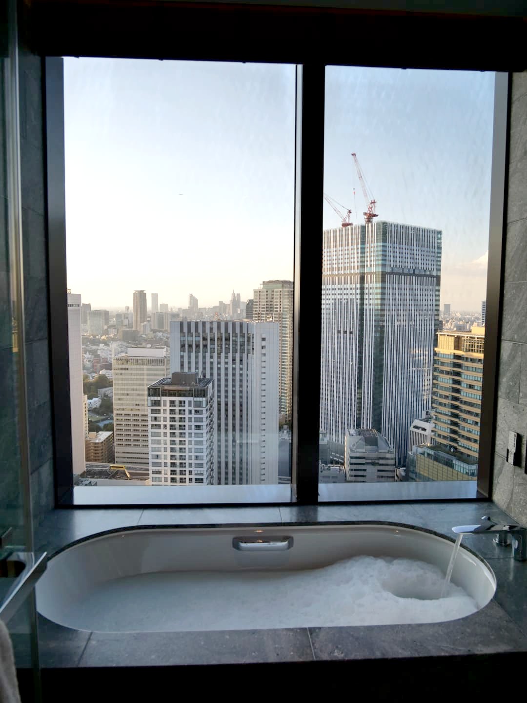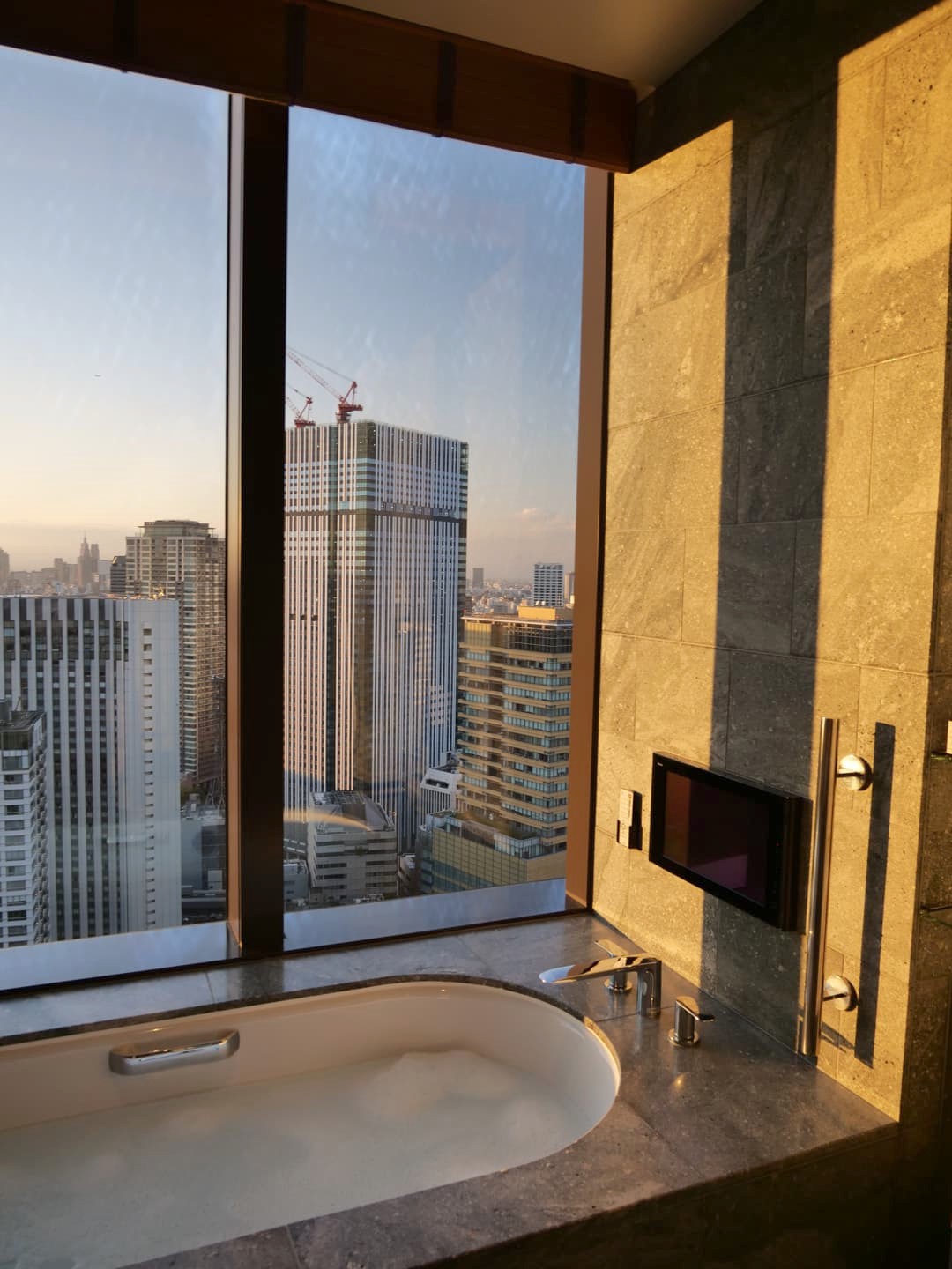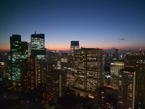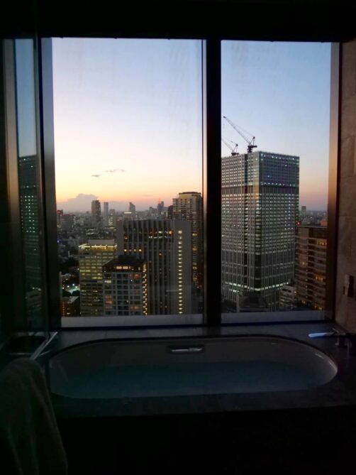 Le coucher de soleil depuis la baignoire, avec même un petit bout du Mont Fuji, et le défilé des avions au loin, était incroyable. Il y a aussi une belle piscine et tout un centre de bien-être que je n’ai pas pris en photo. Si vous en avez les moyens, foncez car vous ne le regretterez pas (et vous pouvez toujours compenser, comme nous l’avons fait, en prenant les nuits suivantes dans un hôtel beaucoup moins cher).