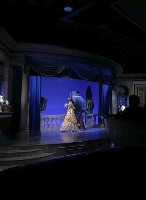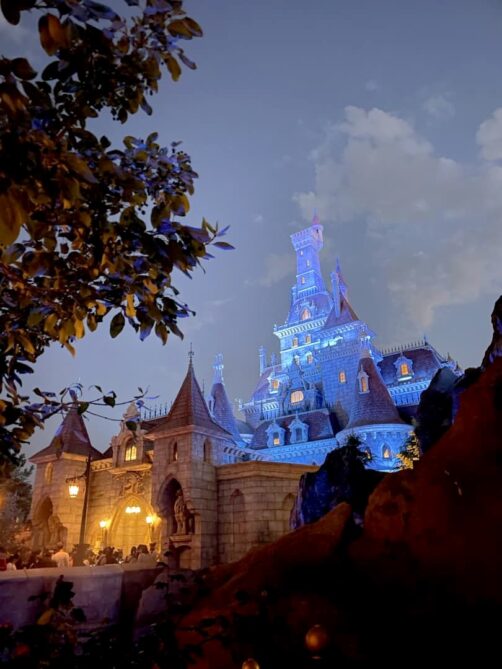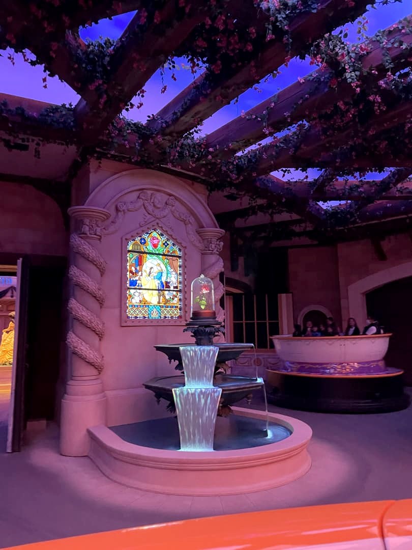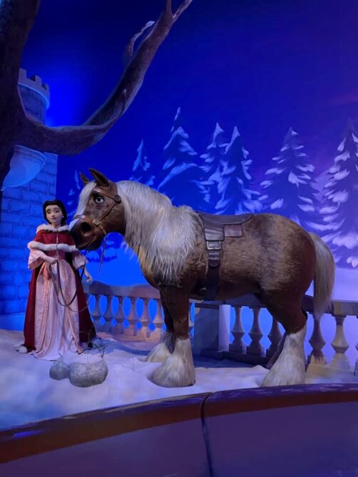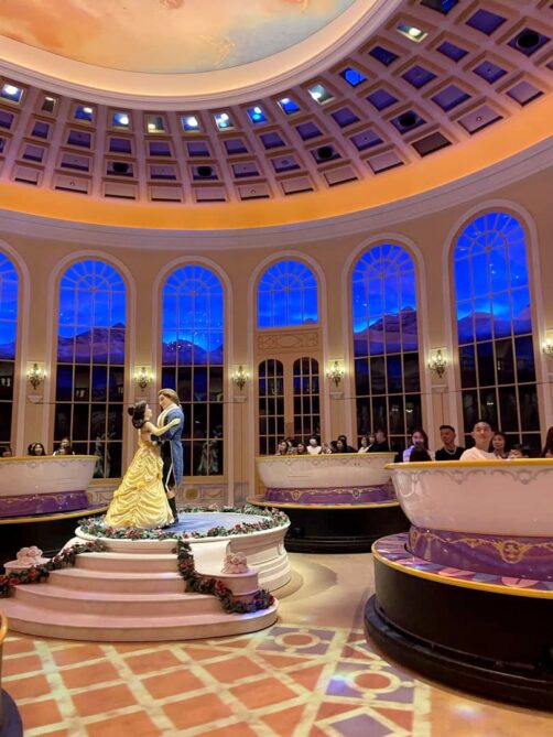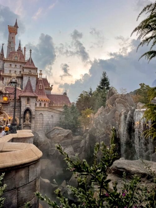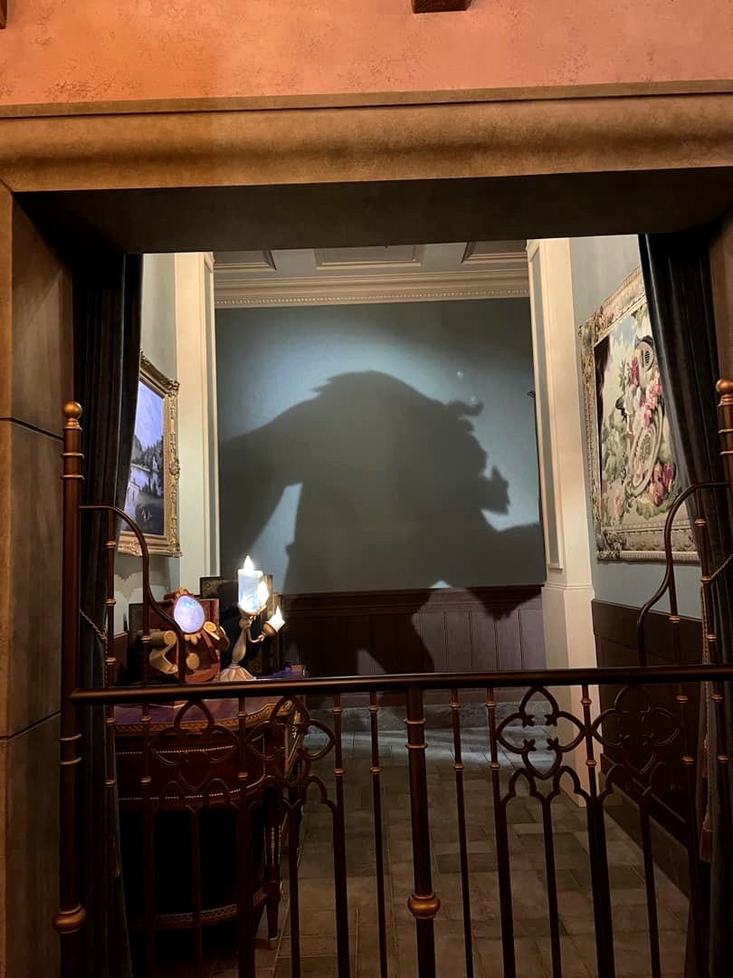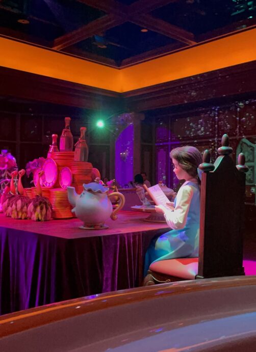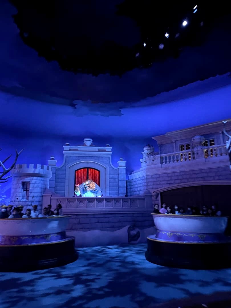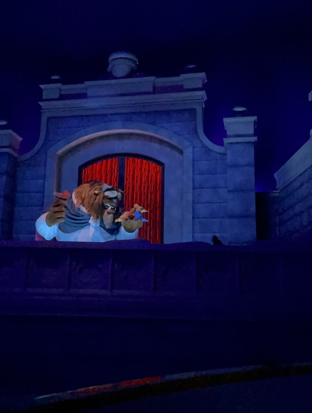 Mais l’attraction star de la zone, que vous ne trouverez qu’ici, c’est l’incroyable The Enchanted Tale of Beauty and the Beast qui a vraiment dépassé toutes mes attentes (et pourtant, c’est mon dessin animé Disney préféré !). Ce dark ride intègre plein de nouvelles technologiques ainsi que des décors splendides. Et s’il y a autant de file, c’est aussi car l’attraction est très longue : on suit vraiment toute l’histoire ! Je ne veux pas non plus trop vous en dire pour garder la surprise mais sachez que ça serait vraiment dommage de venir jusqu’ici sans la faire. C’est pourquoi je vous recommande de prendre le Premier Pass dès que vous mettez les pieds dans le parc. L’attraction se situe dans la nouvelle sous-sone de Fantasyland qui est dédiée à l’univers de la Belle et la Bête, qui a même son petit château.