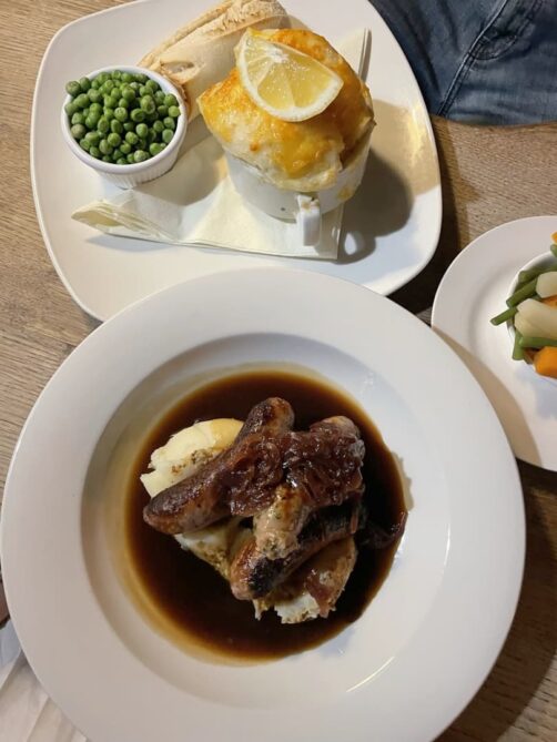 Pour manger dans le village le soir, il n’y a que le pub, The Crown Pub, qu’il faut réserver à l’avance (ben oui, plusieurs B&B et un seul pub, il est très demandé !). On a opté pour le trio de saucisses locales et une « homemade fish pie », c’était très bon.