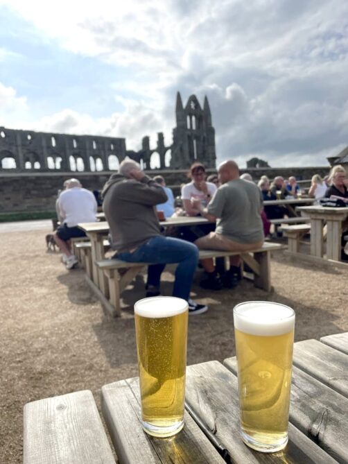 Pour faire une pause après la montée vers l’abbaye, je vous recommande de vous arrêter boire un verre à la Whitby Brewery, dont la terrasse se trouve juste en face des ruines. Bonnes bières et ambiance sympa !
